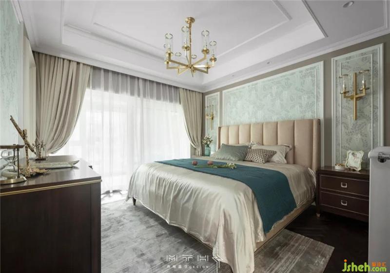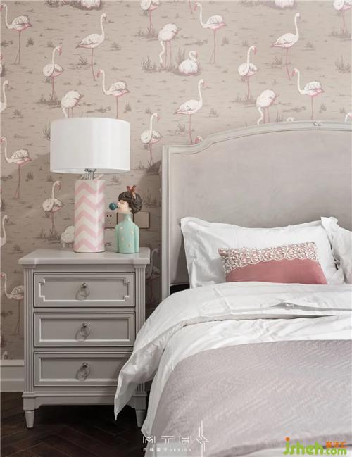 女儿房选用粉色作为环境色,暖灰色实木家具与白色床品搭配给人宁静之感,南京装修设计而床头满贴英国Cole&Son的Flamingos系列壁纸则增添了活泼的气息。