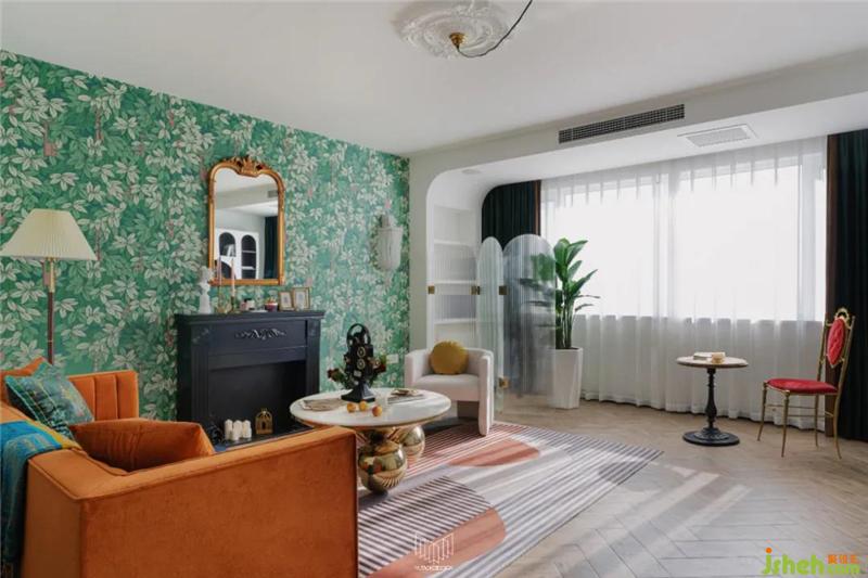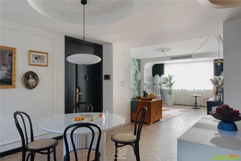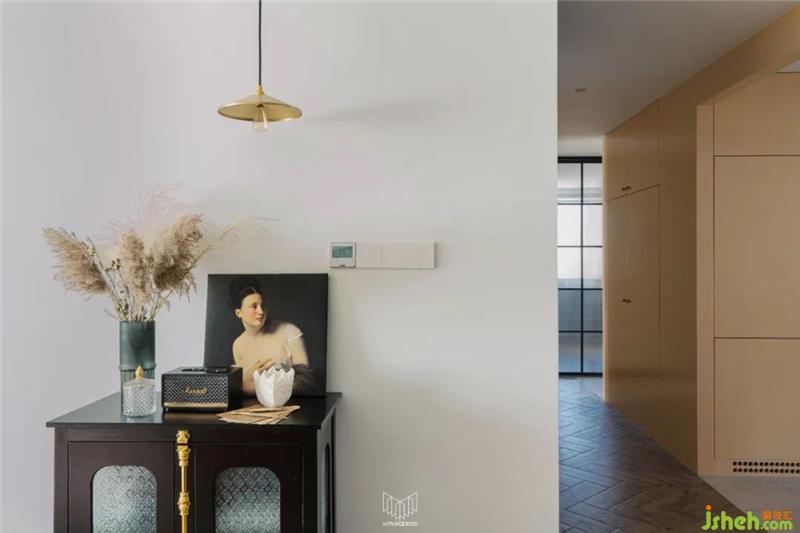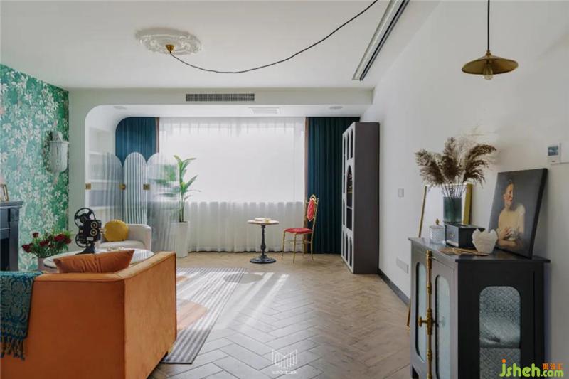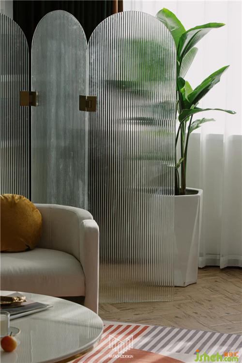 客厅划分一部分空间作为休闲阳台,考虑到采光,摆放长虹玻璃折叠屏风。南京室内设计师靠窗户位置放置业主海淘的中古休闲椅及边几,让休闲阳台也成为客厅的互动空间。