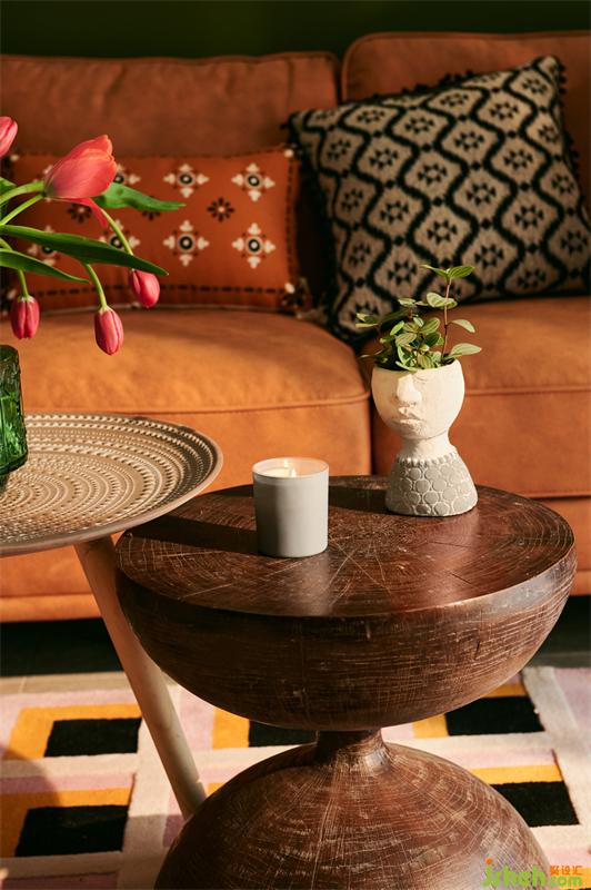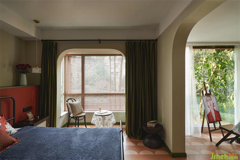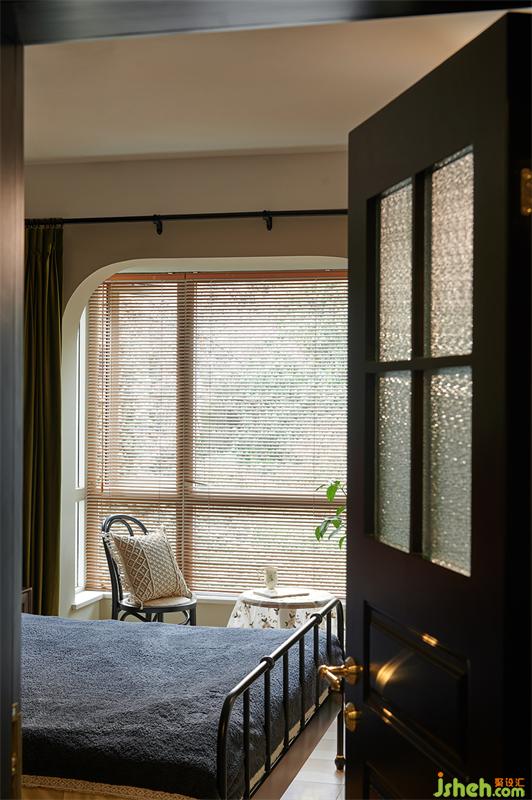 家居设计舍弃生活阳台,副卧与画室一体,方便主人日常的绘画习惯,并使用金属床架以及暖色图案地板花砖,理性中显露的感性,被绿植环绕,围成一方天地。深色套装门夹花格玻璃,花砖地面,增添复古感。