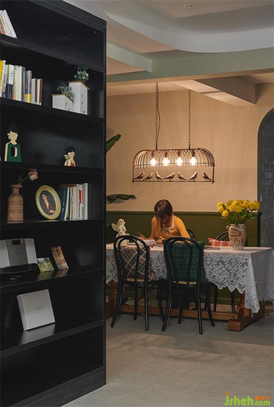 餐厅处于整个中心区域,餐边设有盥洗台,酒架。另一旁则是大面积的黑色木质书架,展示业主所有的回忆,收藏,手伴等。白色钩花桌布及藤编餐椅,顿时让人穿越到儿时。