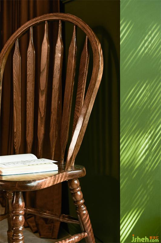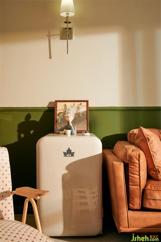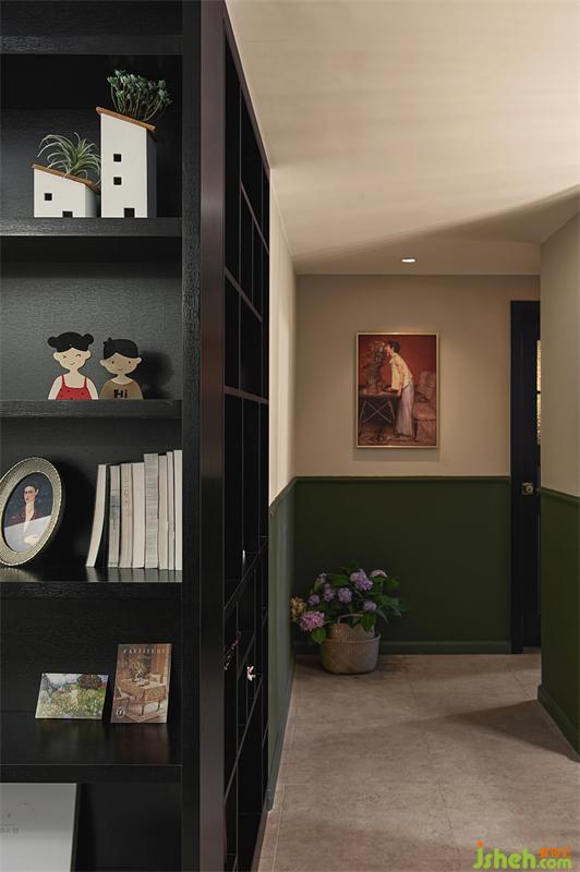 设计师运用冷暖色彩,在内敛中寻求突破,整体以冷静包容的复古绿为半墙基调,结合温暖跳跃的暖色,在画框中演绎一幕又一幕碰撞与融合。