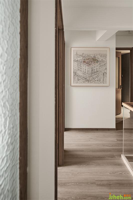 顺着楼梯走往二楼,可俯瞰整个入户空间。二楼的主卧门采用艺术玻璃的形式,把自然光引入过道区域,让过道以及整个挑空区都因有自然光的介入而通透明朗。
