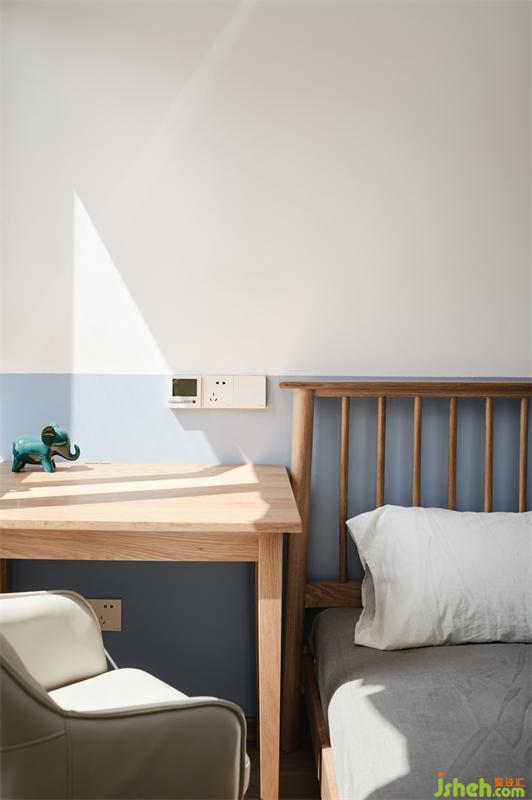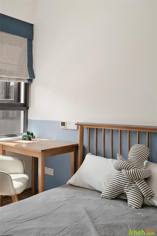 一楼布置的儿童房,家居设计采用小朋友喜爱的蓝色系,添置与整体风格一致的原木色家具,实用又美观。