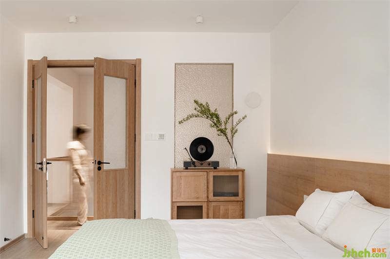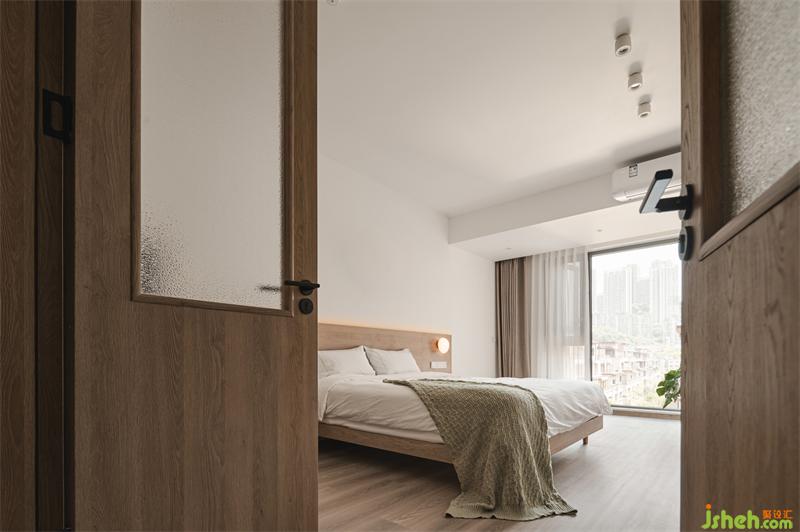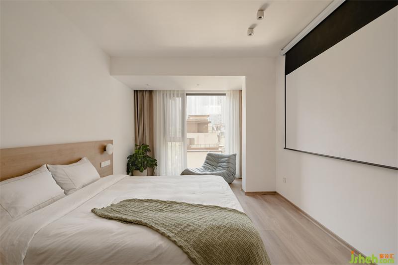 推开充满仪式感的木质双开门,来到宽阔的主卧区域。实木的床头与空间呼应带来视觉的统一,一旁的懒人沙发可让女屋主惬意自在的享受一个人独处的恬静时光。