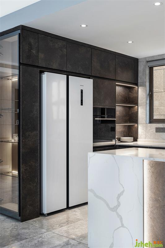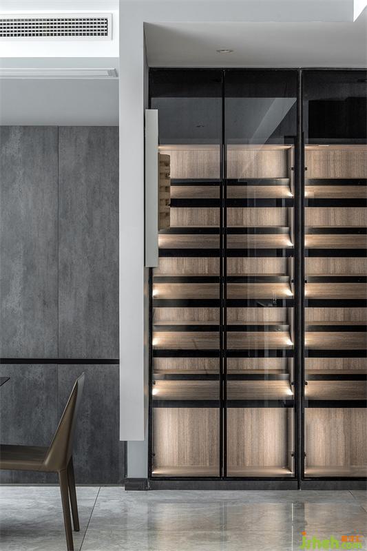厨房巧妙利用空间设置酒柜,玻璃柜门,朦胧灯光,平添高级感。岛台通过设计比例构成而定制。