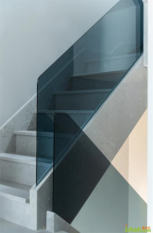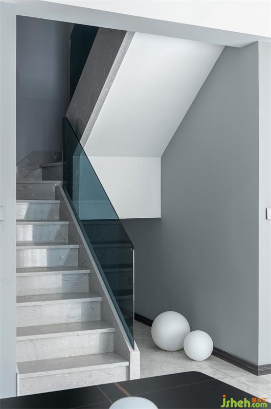 楼梯设计采用无扶手,落地灰玻,让楼梯空间简洁宽敞。延续通透的设计手法,现代时髦又明快。