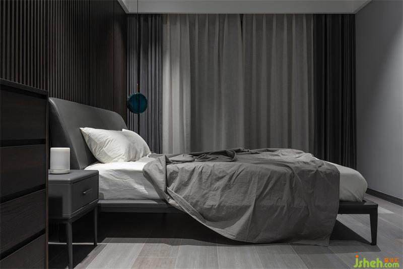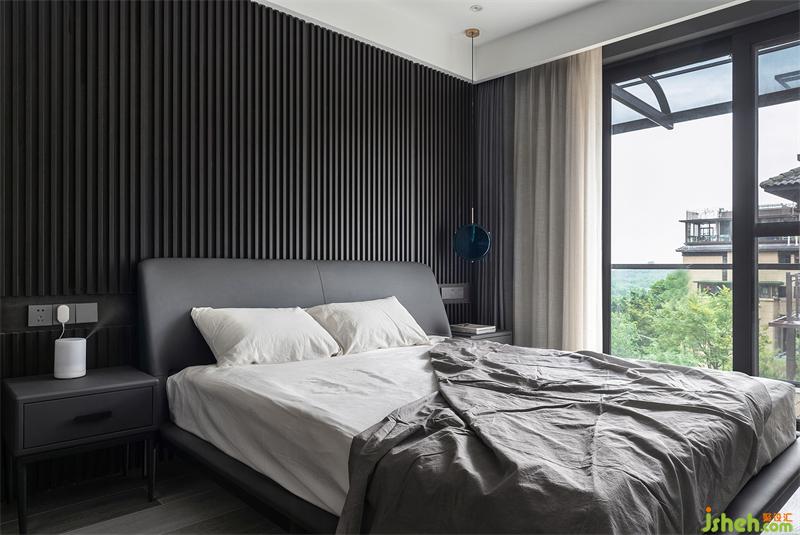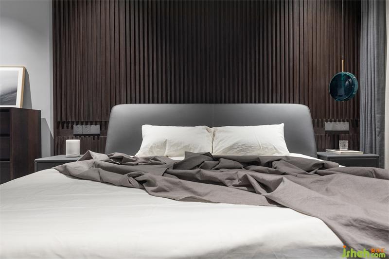 主卧房内暗阶色调,渲染安稳的气氛空间;床头用波浪板饰面造型,灵动有序,让整个安静的空间动起来。