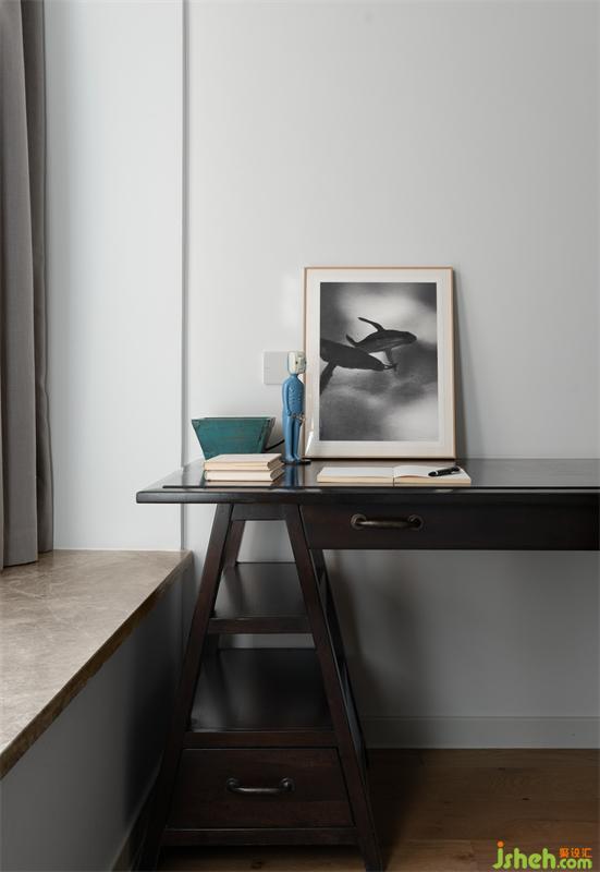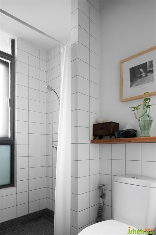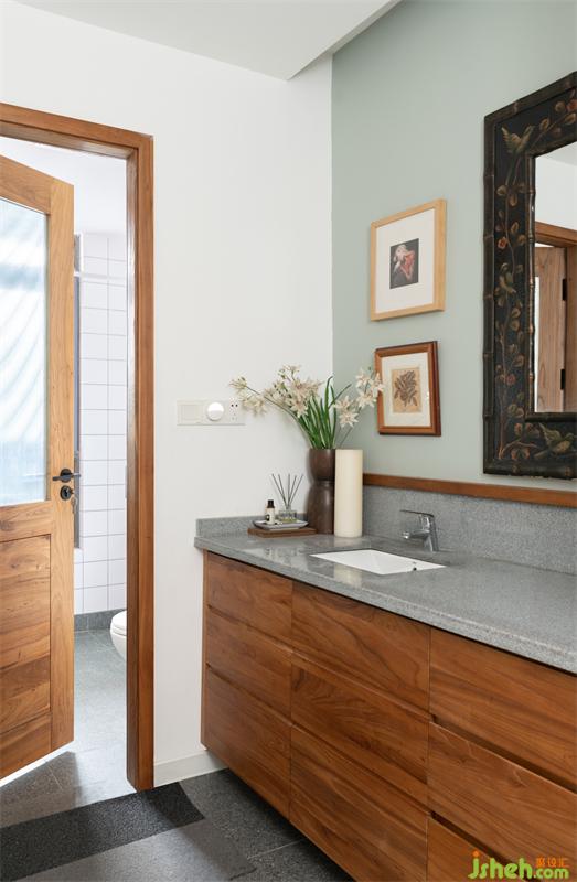 公卫的设计简单干净,淋浴区只用一段小墙隔离,暗藏浴帘,方便简练;洗脸区的超长浴室柜储纳充足,使用方便;古董手绘镜子和日本原作版画,现代摄影小品的组合,使得这个常用的功能区别有风情。