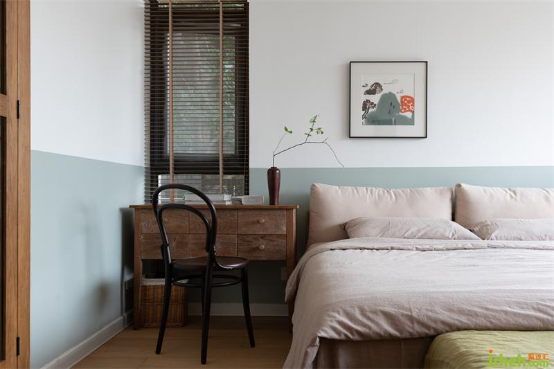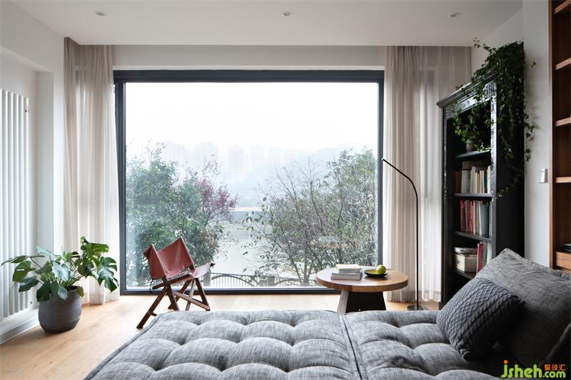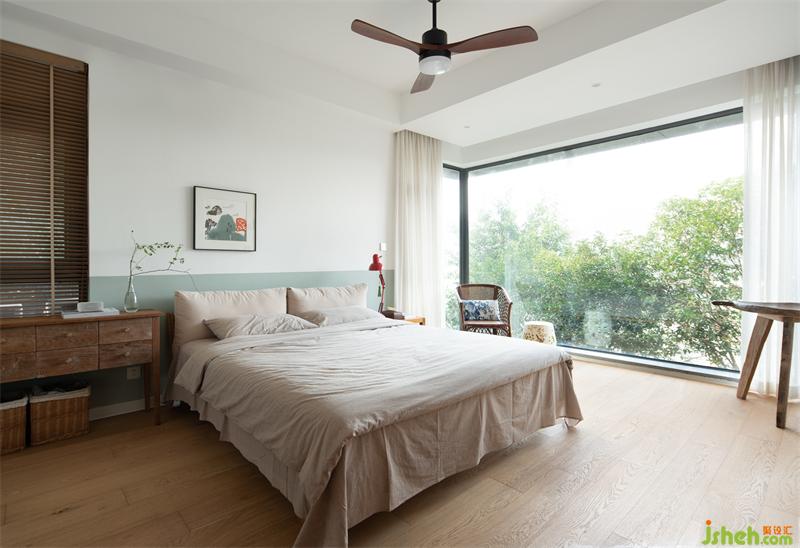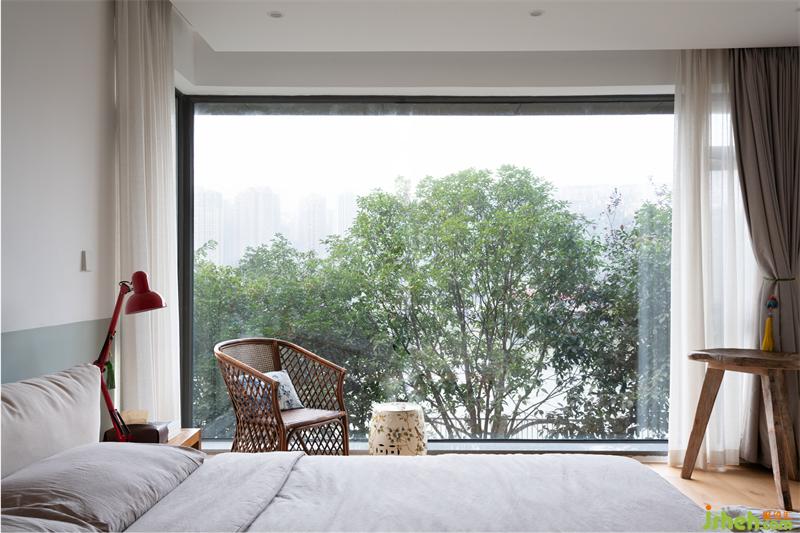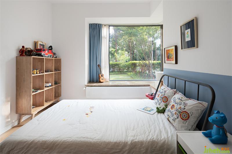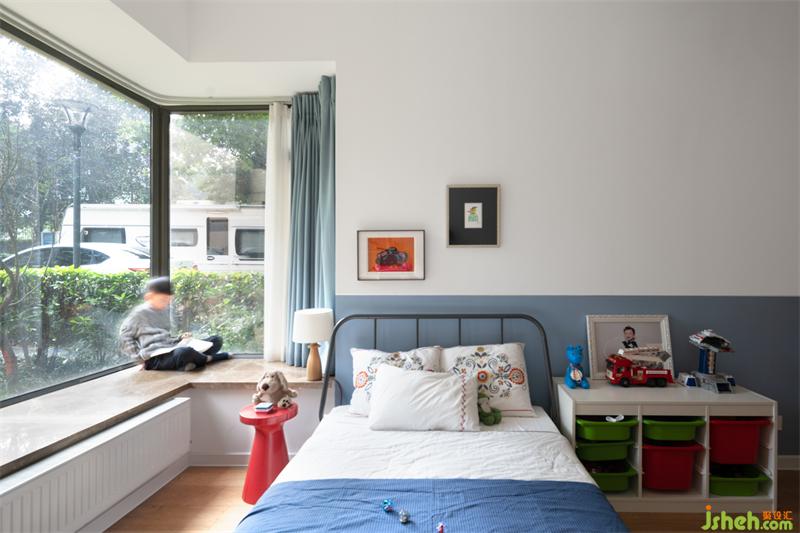 儿子房有一面难得的转角窗,阳光充沛,小朋友喜欢面对花园,坐在飘窗上看书,玩耍,设计师特意在窗前种了一株红枫树,既可以遮蔽隐私,还可以看到一年四季的树叶,由绿变黄,转红,再到落叶的唯美变化;床头的画,分别是土耳其和中国小众艺术家的原创作品。