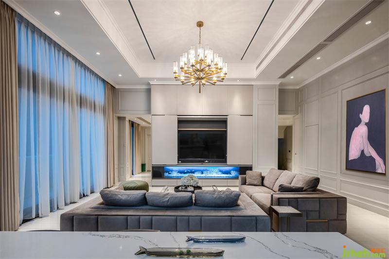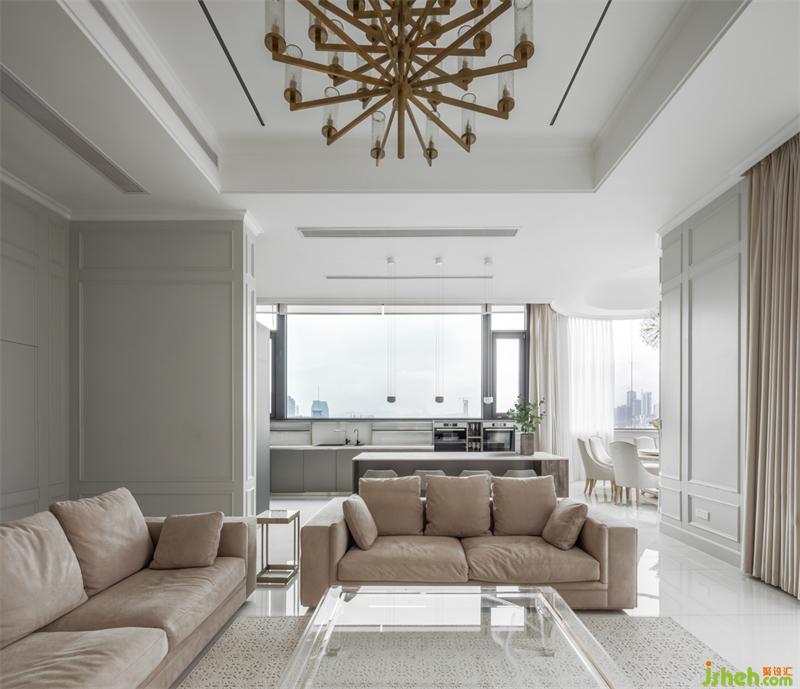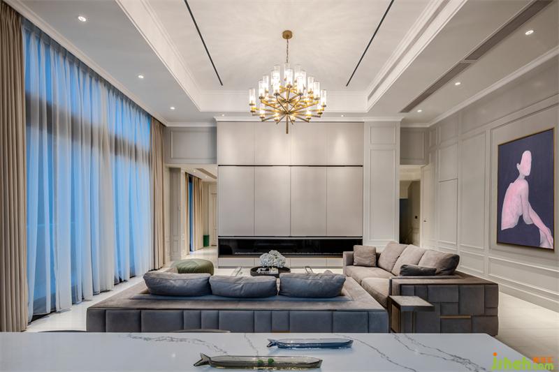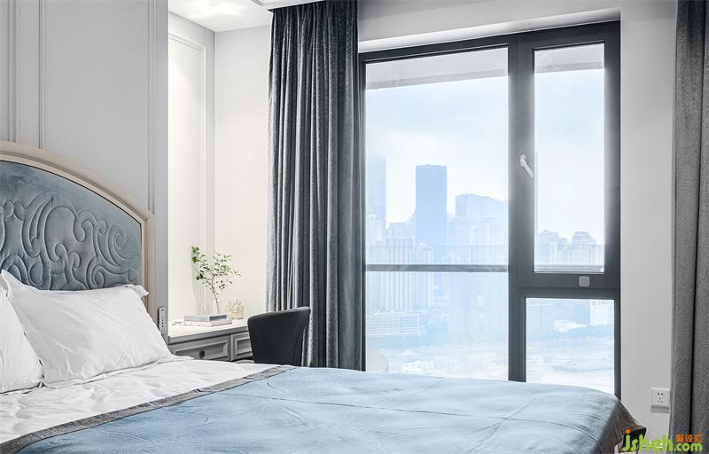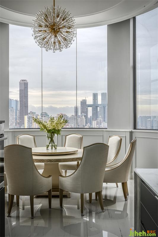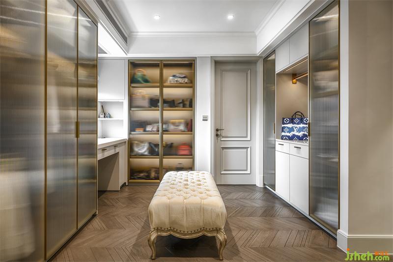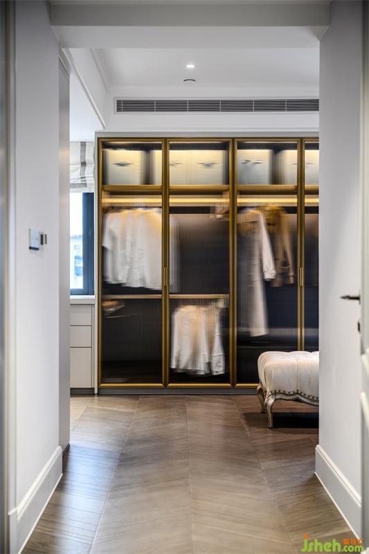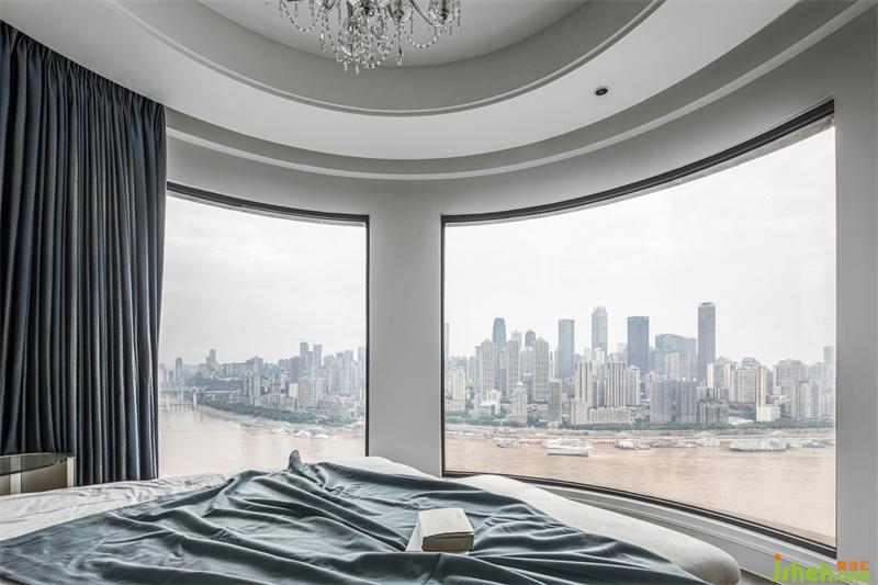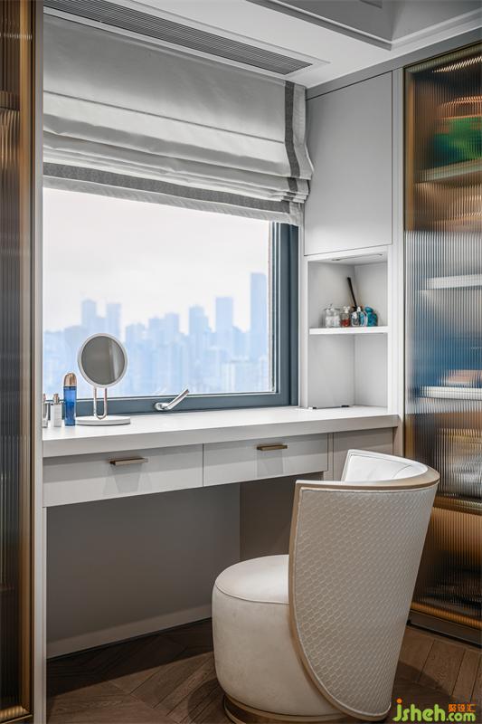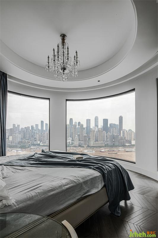主卧的弧形落地窗,窗外是人间繁华,窗内是温暖安全的家;整体定制超大衣帽间,家居设计细分了挂衣,折放,熨烫,包,鞋等分类空间;专属梳妆台前,可以看到一整幅大江东流的画面;一层的公卫,采用圆弧形设计的盥洗间,完美融合了鞋帽间和公卫的双门,公卫淋浴间里,更是巧妙的嵌入了一个干蒸房。