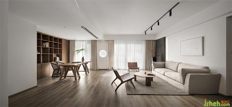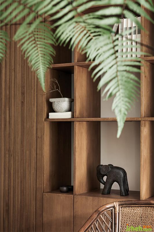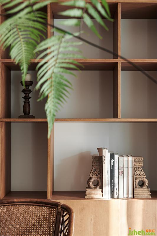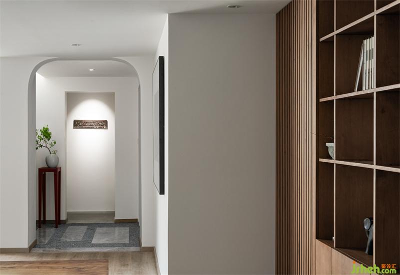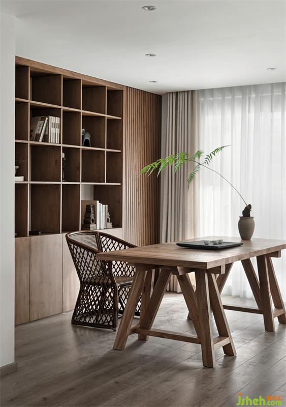 业主父母喜爱阅读,我们取消了电视,用书柜和书桌代替作为日常的休闲活动,书桌上置有茶台,喝茶看书或沙发区闲坐聊天,每个日常都充满惬意。书柜选用原木色和不规则隔板设计,沙发区背景使用留白的手法用冷静的肌理石材调色,使得空间沉稳。