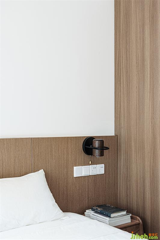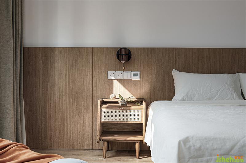 主卧床头面板选用温暖色调的原木色,圆弧收边的小圆脚床头柜,使整个空间的线条柔和感放大,阳光的照射释放了空间活力。满足了他们早起床边阅读的习惯。