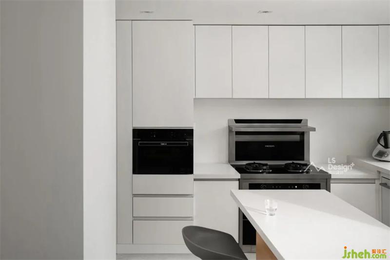 餐厨空间是将原有的次卧打开,生活阳台外移,形成方正开阔的餐厨空间。色调极其简洁,素雅的线条,摒弃一切多余,营造出日日是好日的安逸生活。
