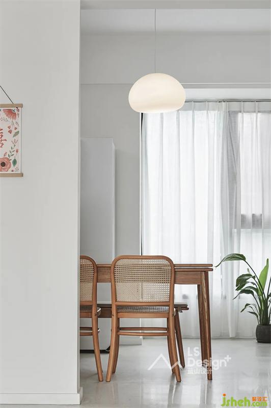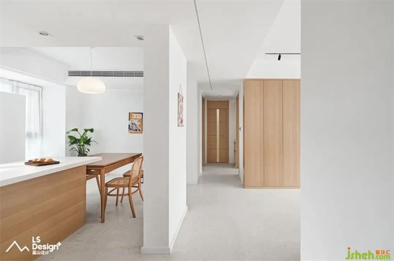 岛台与餐桌高度高低构成,白色岩板与温暖木制家具的结合,让业主舒适切身沉浸于烹饪与用餐的美好时光。