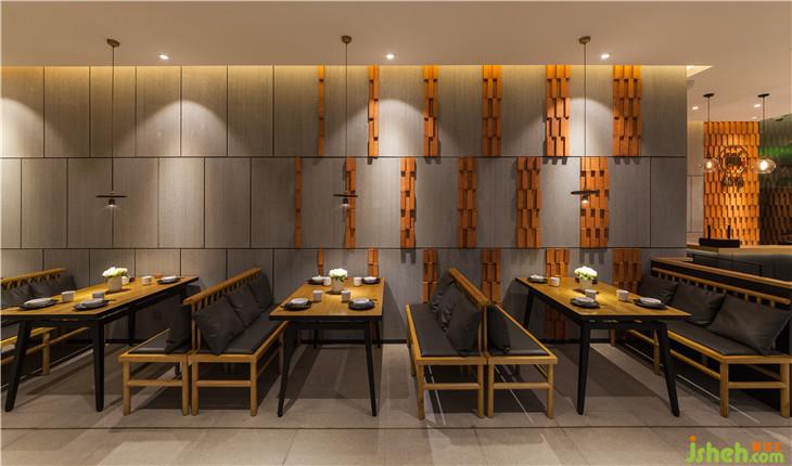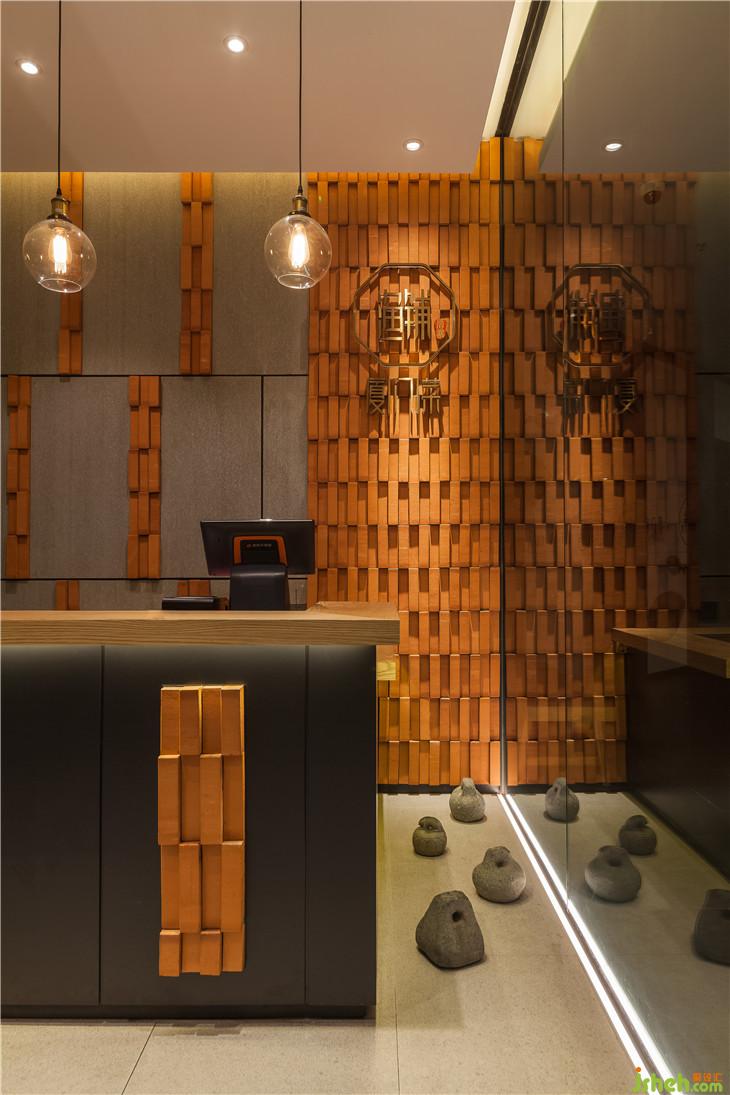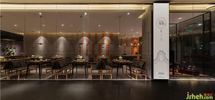渔铺是一家以厦门菜为主食的怀旧的现代餐厅,在餐厅装饰材料使用上,大量采用闽南传统古厝的红砖元素材料来构造。踏入餐厅大门既在灰色美岩板的墙面呈现一堵红砖墙的设计构造,唤起用餐者对老厦门红砖古厝的记忆。在照明设计上,整个空间采用暖色系。在心理学的角度上来讲,暖色系更能够刺激食欲,而在暖色调的灯光下进餐,也会显得更加浪漫富有情调。用餐区域强调了局部照明,以实用性与情调兼具为出发点,在局部照明灯具的选择上使用了复古怀旧的小吊灯。墙面照明则是使用射灯来激活红砖墙面装饰。整个空间照明将材料的质感、肌理,以及空间的色调进行有机结合,营造出一个气韵生动的用餐空间氛围。