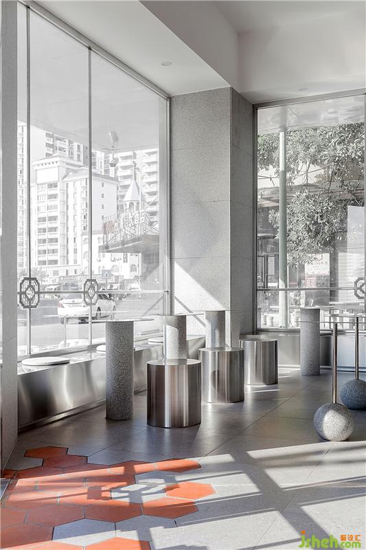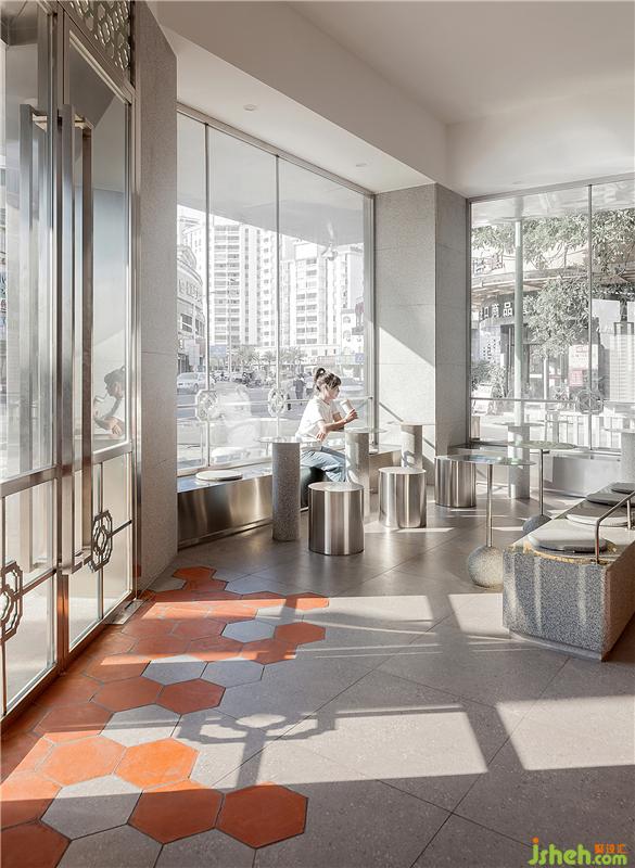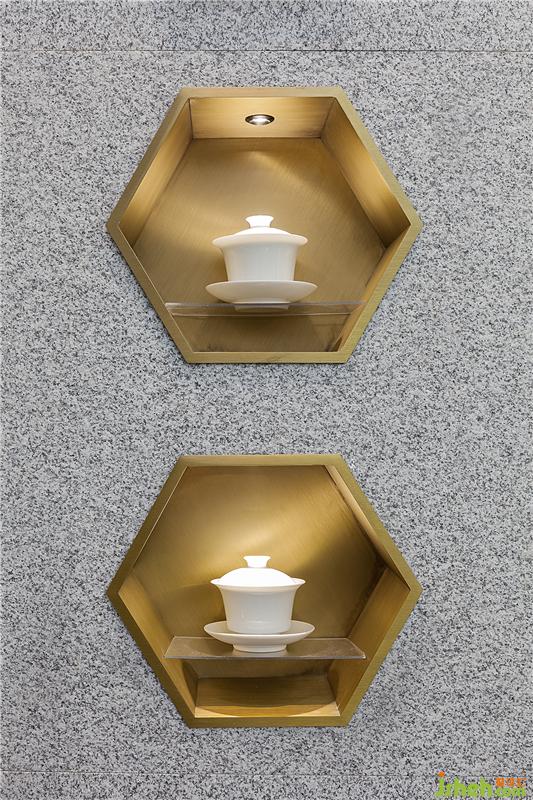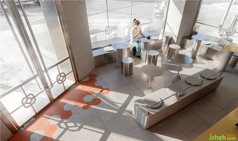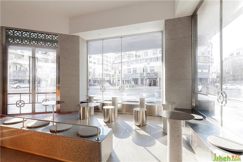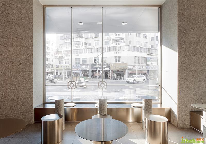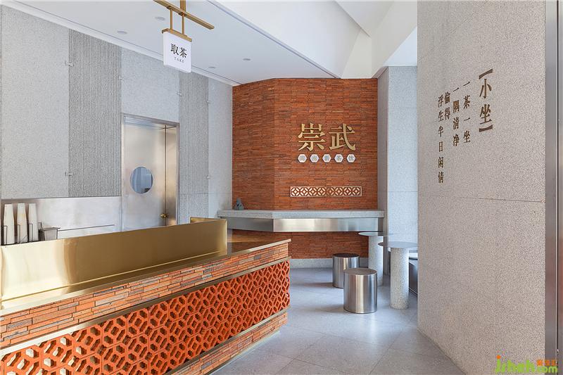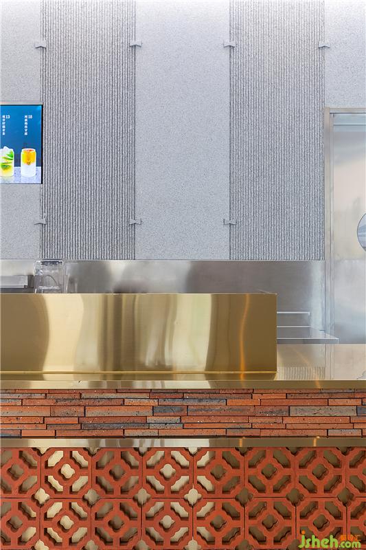 传统的闽南花格与现代灰冷的钢板相互碰撞,精致复古的黄铜元素点缀,以及花岗岩背景墙板间的卯榫石扣件等等,都在深度挖掘一种闽南传统建筑元素与年轻化的设计语言相结合的新式闽南茶饮空间。