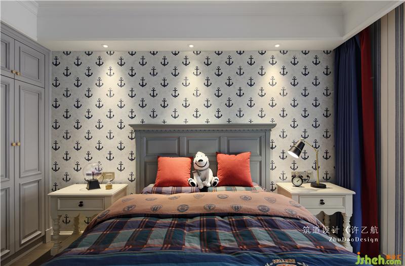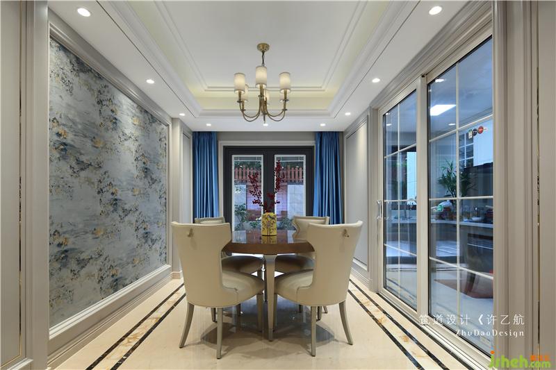 一楼整体格局基本不变,客餐厅整体以美式风格为主,色调采用蓝色点缀,使空间更加沉稳,灰色的硬包和沙发与蓝色的抱枕颜色明亮却不刺眼,同时更拉升了空间的层次感?。主卧整体采用素色,均衡感、色彩、节奏、工艺......均契合设计中共同认知的形式美法则,在调和对比、多样统一中,营造出和谐纯净、怡然清幽的氛围。背景线条与纯色窗帘元素,体现设计的和谐美。