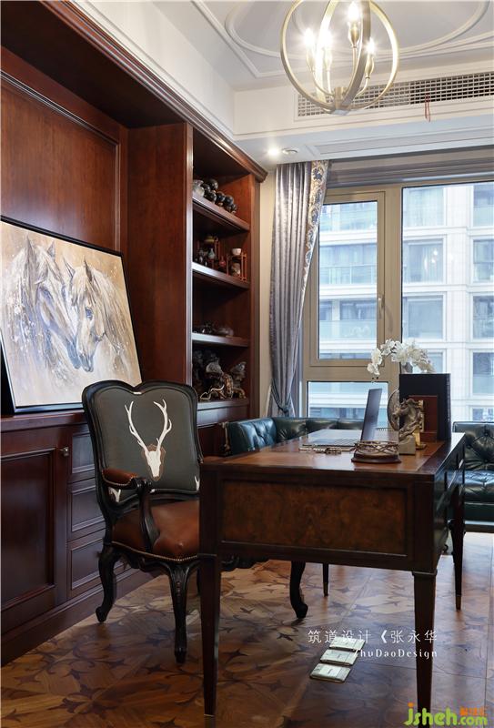 纯真的古典空间,加了一组古典蓝的皮质沙发让主人的书房多了些稳重与时尚!
