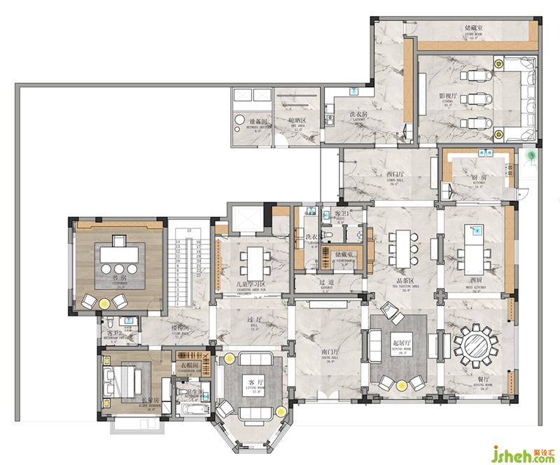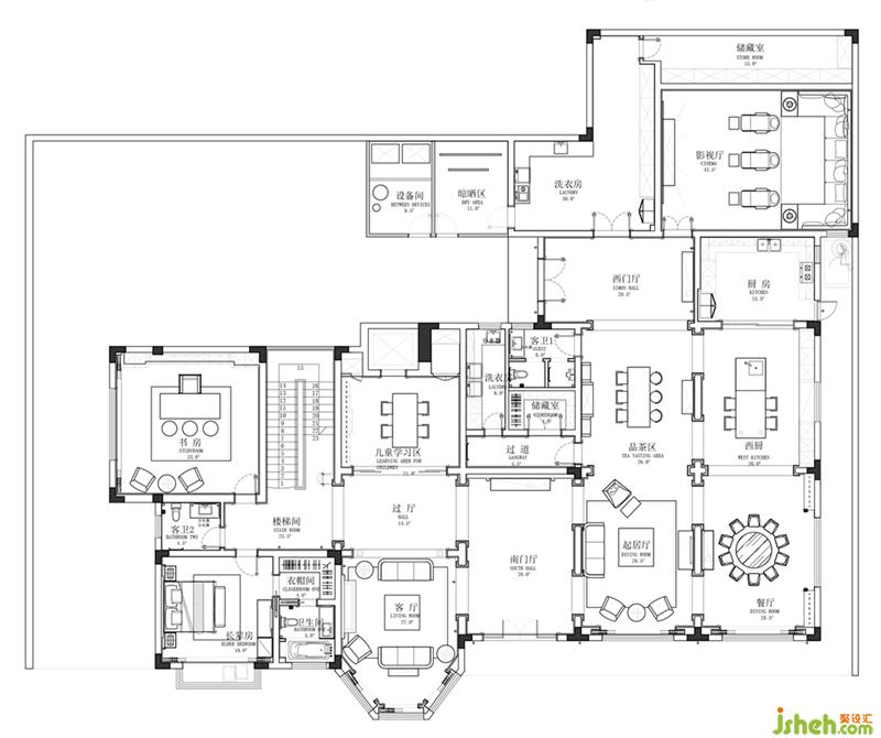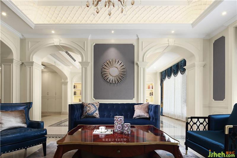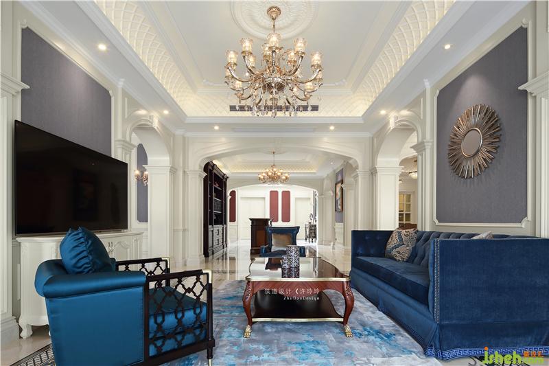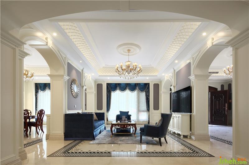 起居厅:整个起居厅是非常具有空间的气势,四个拱形门洞很好的与门厅、餐厅互动起来,整个区域既有独立又有对称。整个空间在色彩上充满着浪漫的气息,经典的蓝色绒布材质,印花地毯,顶面弧度的线条令人眼前一亮。别墅装修设计