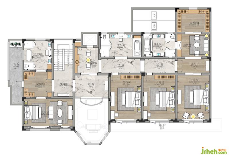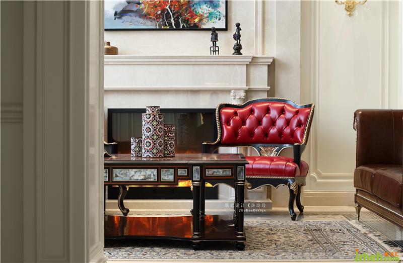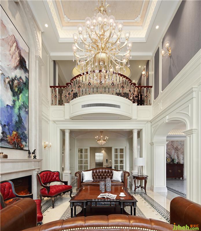 客厅:客厅是挑空的空间,大理石的背景,挑空的跃台与楼下空间的互动,欧式的罗马柱等等都彰显了别墅的气势与豪华。空间的设计颇具法式新古典风格,欧式壁炉、油画,起到了画龙点睛的作用;欧式线条的运用增加了整个空间的高贵气息。别墅装修设计