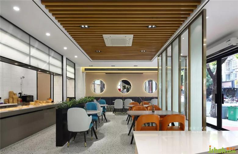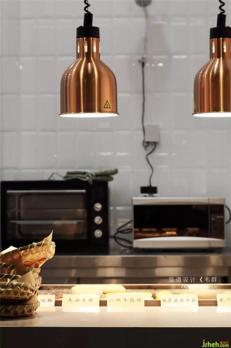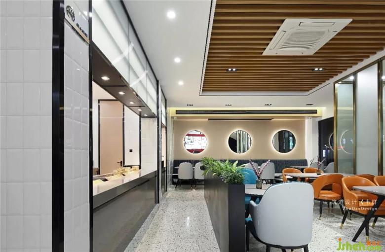 其中正对街景的是一整面明档,干净卫生。后厨的所有操作,客户都能看得见;同时也充当了展示作用,工作人员的的配餐流程,细节态度也是店铺的一个文化呈现。在空间概念上,设计师为客户的选餐、取餐、购餐,构建了一整条流畅的时间动线。