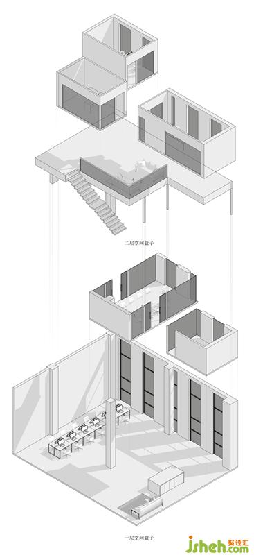 建筑犹如室内的外壳——表现为实体,室内犹如器皿的内容——表现为虚空,两者密不可分。在这个空间里,设计师利用内建筑的手法,力求解决一个办公场所需要的交通系统、构造系统及空间系统等问题。 办公室设计