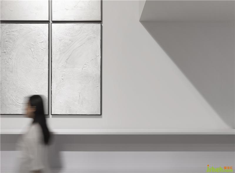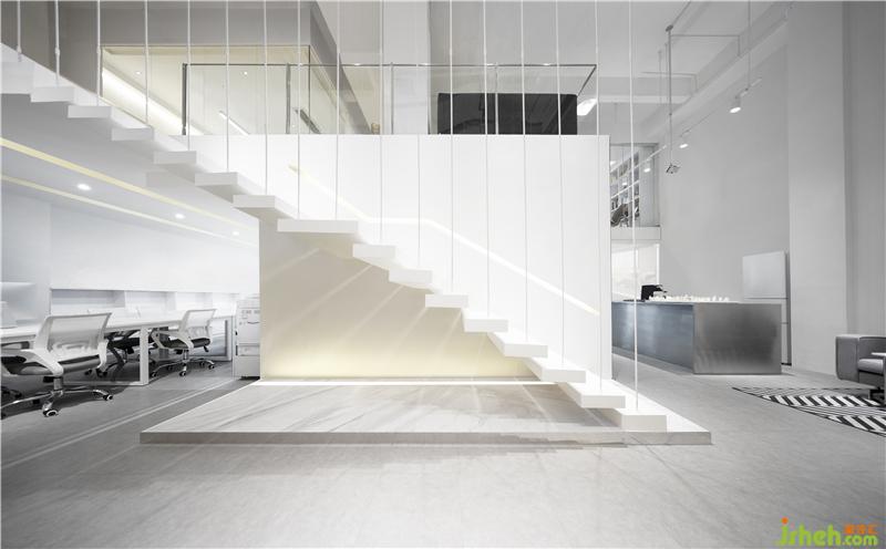 一层空间有一个肆意环绕的动线,同事们可以在办公室内任意穿行,没有束缚的办公环境,更加有利设计师们思维上的开拓。潘多拉的魔盒其实在设计师的头脑风暴里。所以扩大脑力劳动者会议空间显得尤为重要,它要够容纳更多的人参与分享,未来能够与更多优秀的团队互动学习。无需过多的装饰去表达,以大面积的纯白和金属色以及透明玻璃等材质,交相辉映出更好的空间语言。 办公室设计