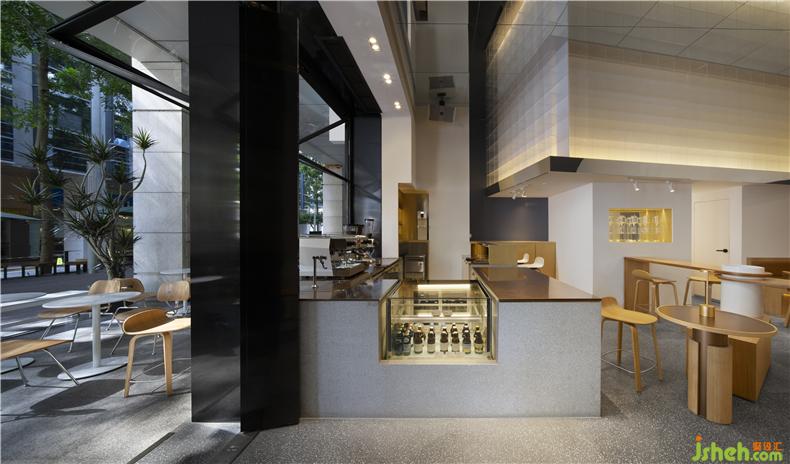 Coffee shop with little overall space and few places to obtain outdoor light sources , designers use huge push-pull windows in it so that outdoor pedestrians and warm sun can come into sight of customers. The design of mirrored ceiling is to more than double the height of the space visually, and also to increase the light and the depth of space in the room.