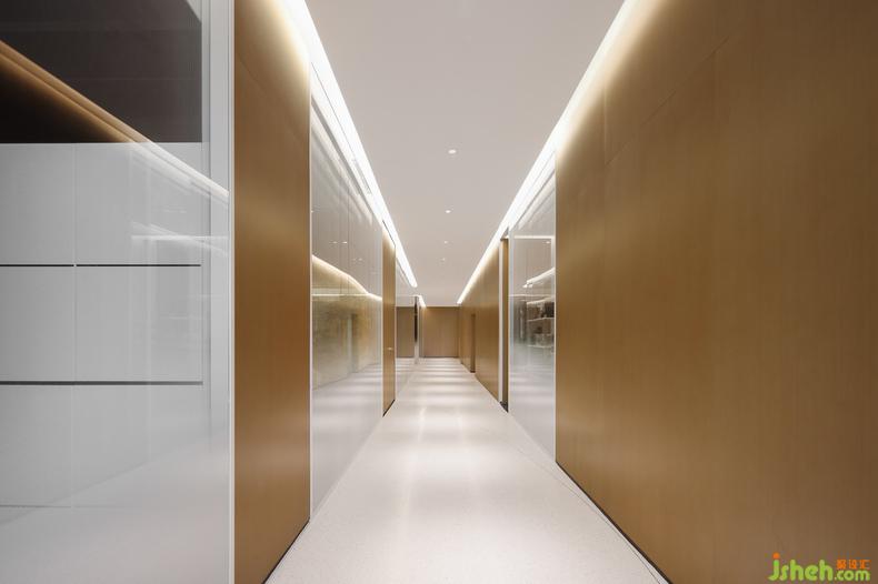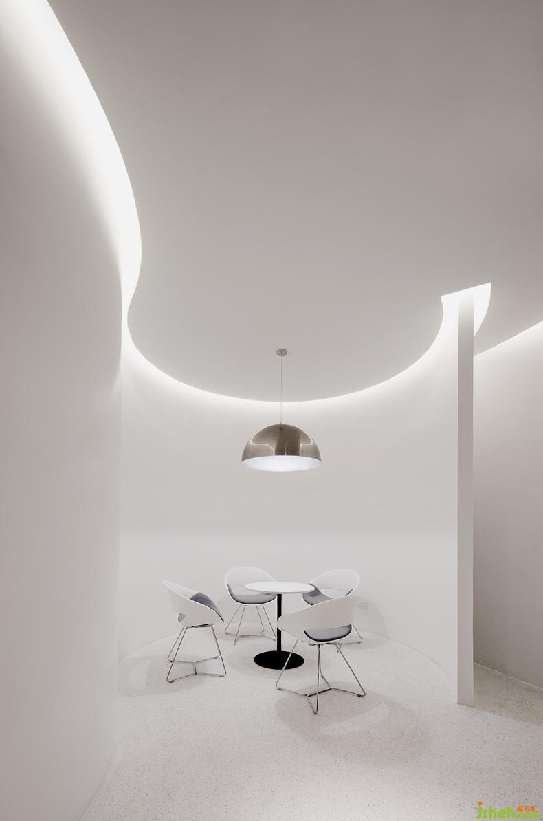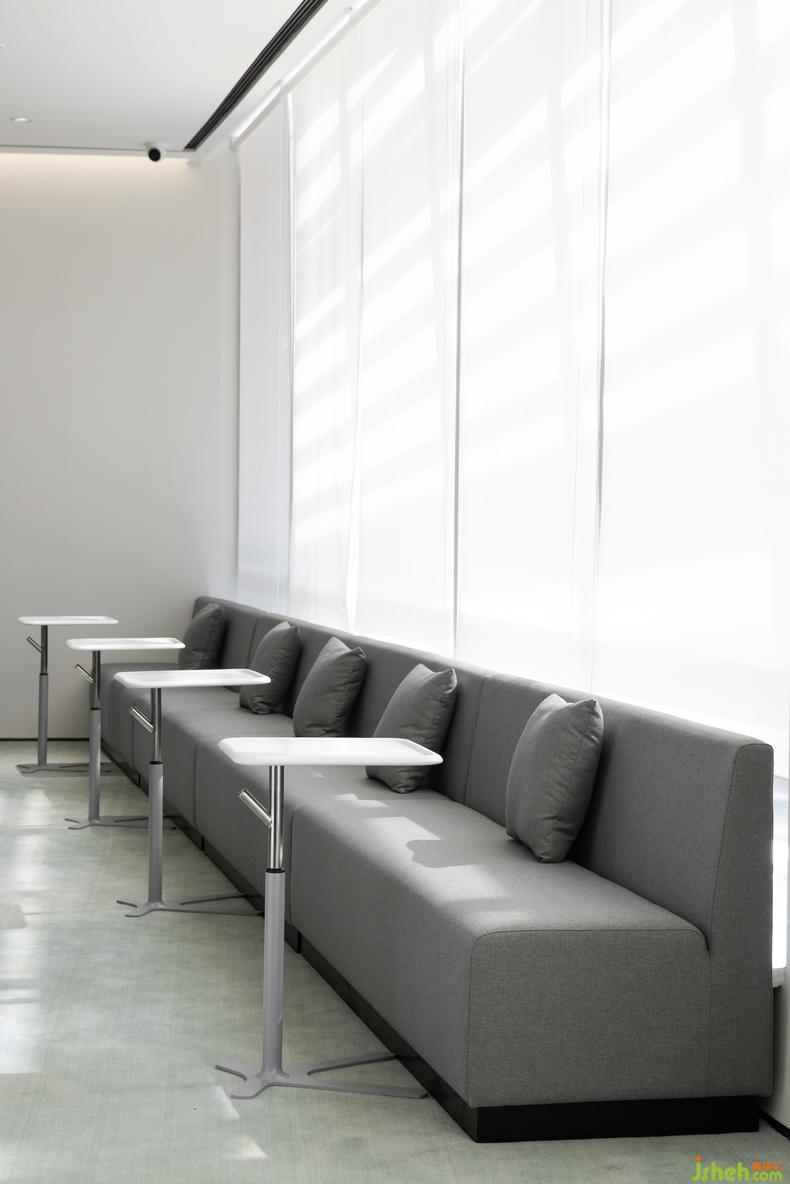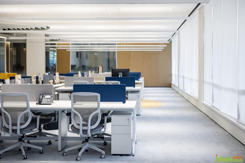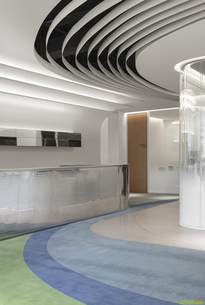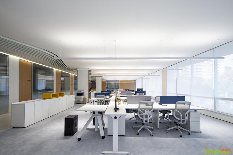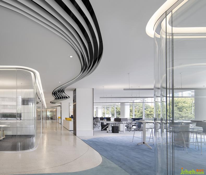 地面的设计与材质也呼应了天花的流线造型,总部办公设计嵌入铜线的水磨石与颜色柔和的块毯分割了办公区与公共走道的界限,它们以飘逸的姿态贯穿了整个场地,也让办公区域与休闲接待区有了柔和而自然的衔接。地毯覆盖的区域就像为人们营造出一个舒适且精致的岛屿。无论是独自工作与思考,抑或和同事进行头脑风暴,还是下午茶闲暇时的漫步,人们都能在这兼具共享与私人空间中感受到这是一间充满活力的办公空间。
