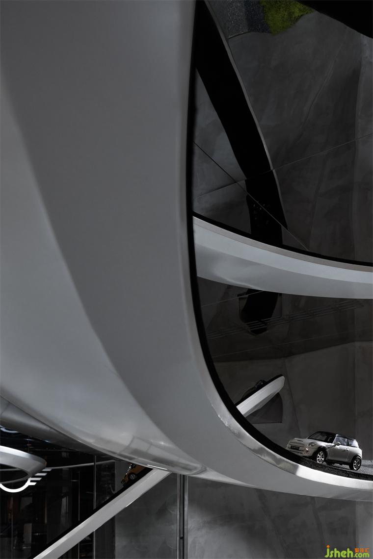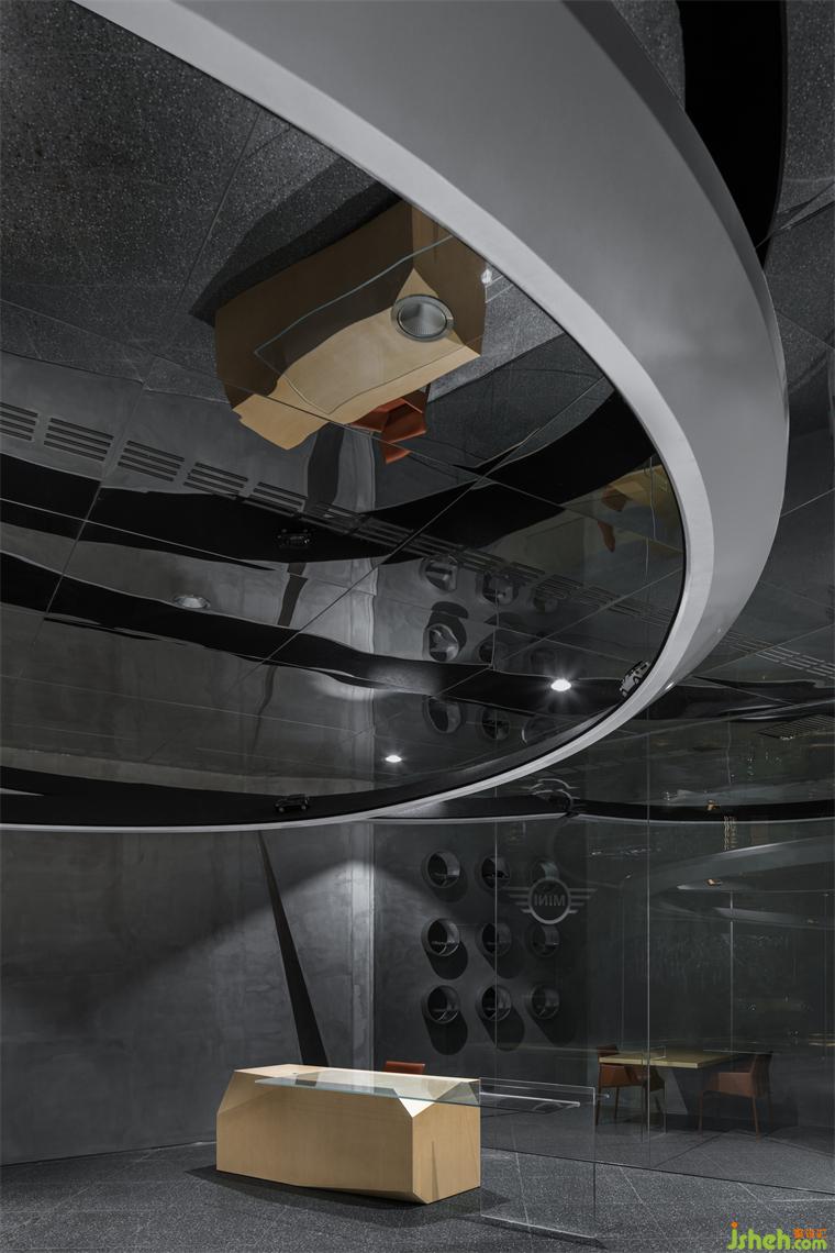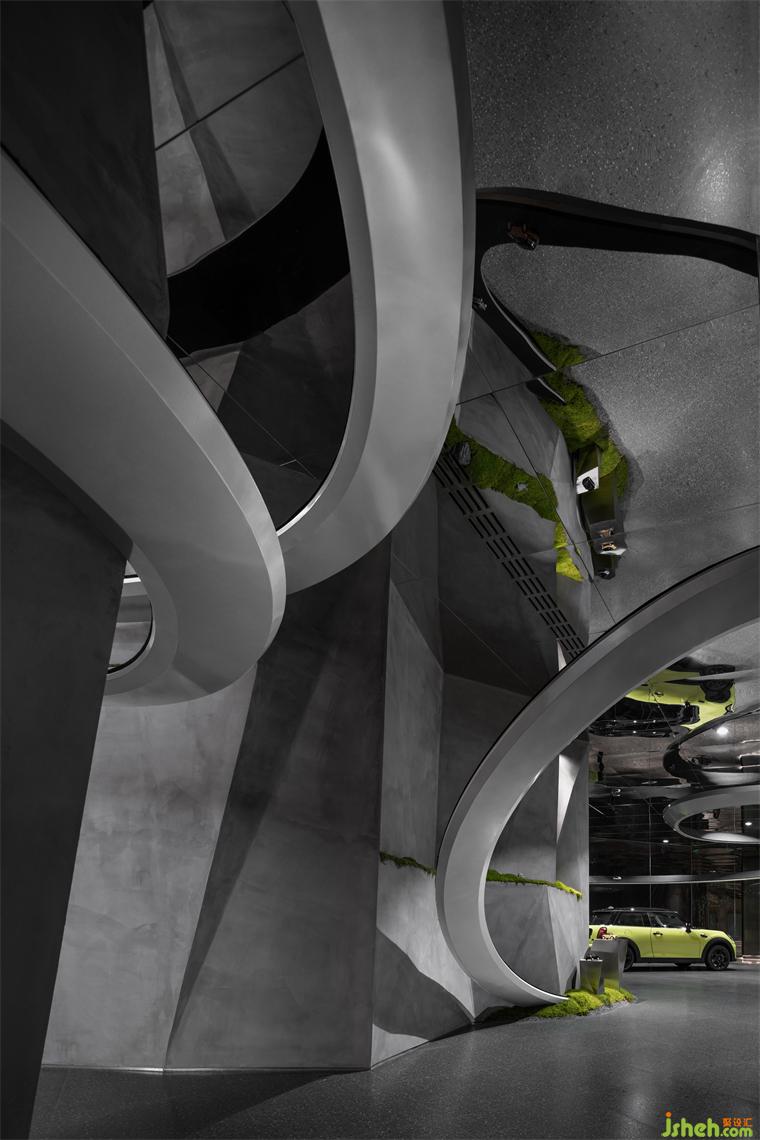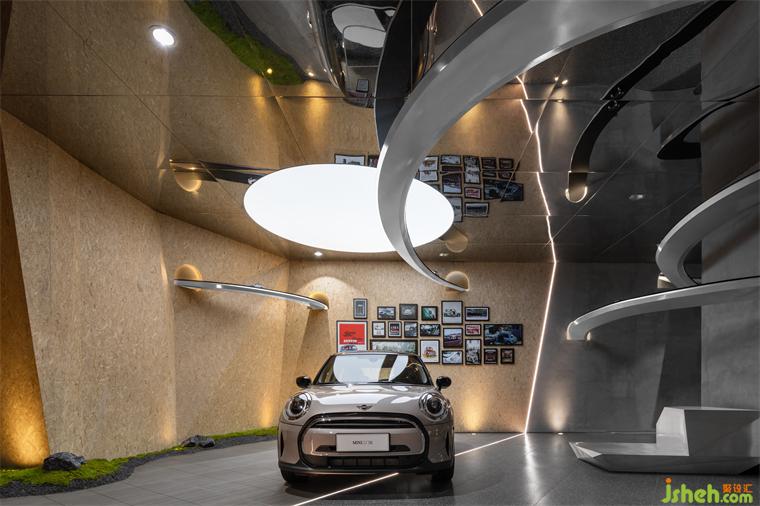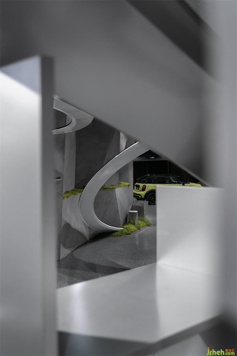 穿插旋绕在各处的跑道赋予空间极具张力的动势属性,是品牌内核理念飞驰的有形载体,展厅设计外化MINI“自由自在”的精神性追求,但看似随意穿行的跑道实则精心构造。