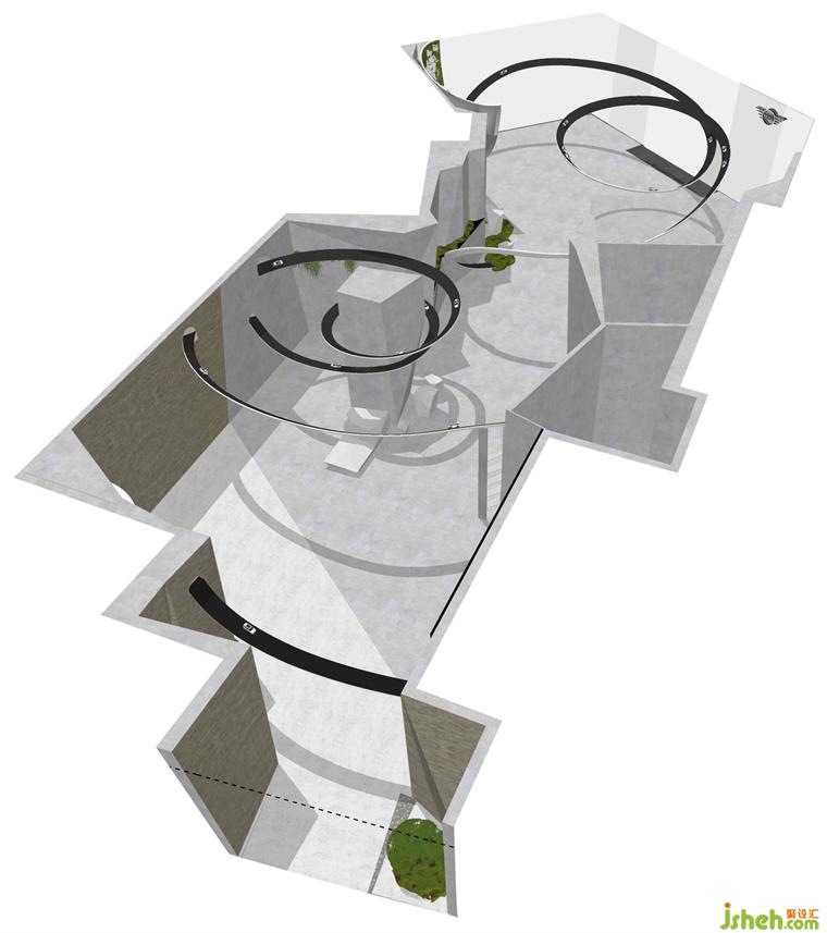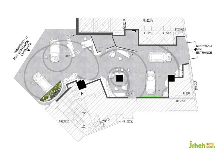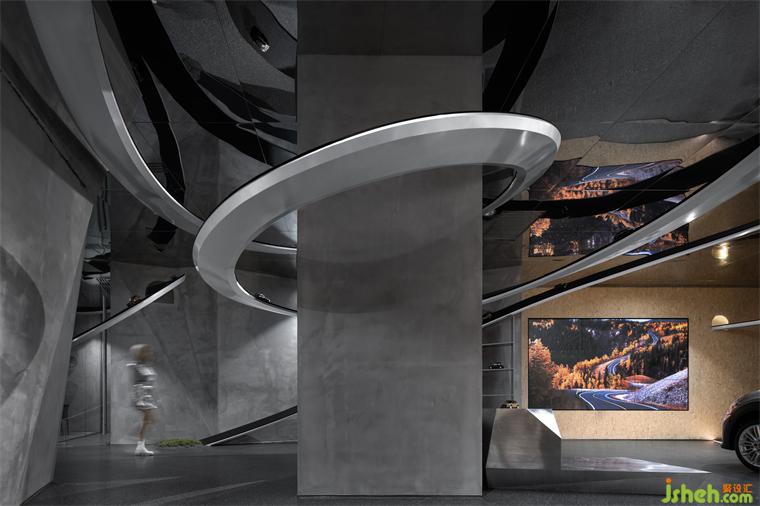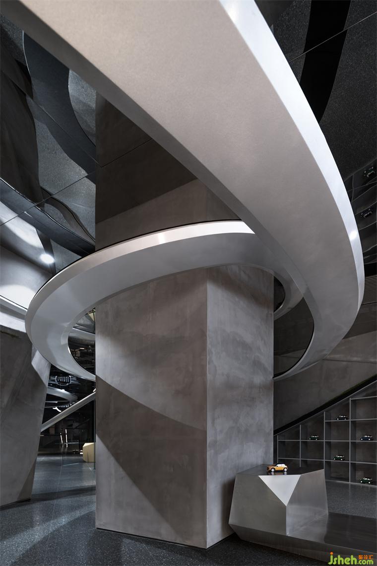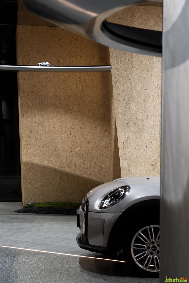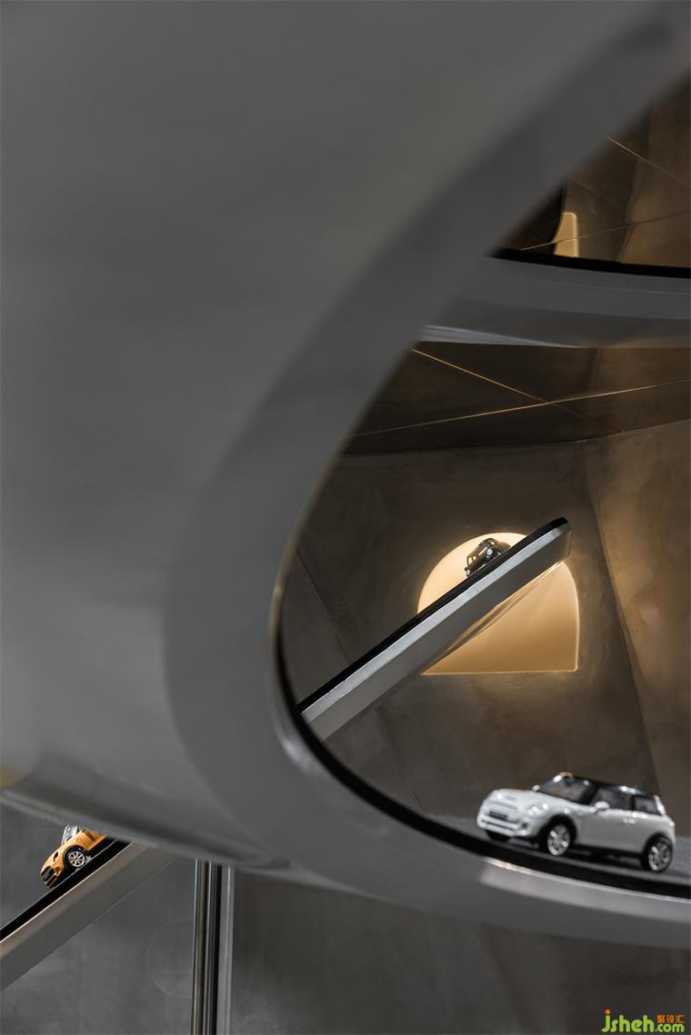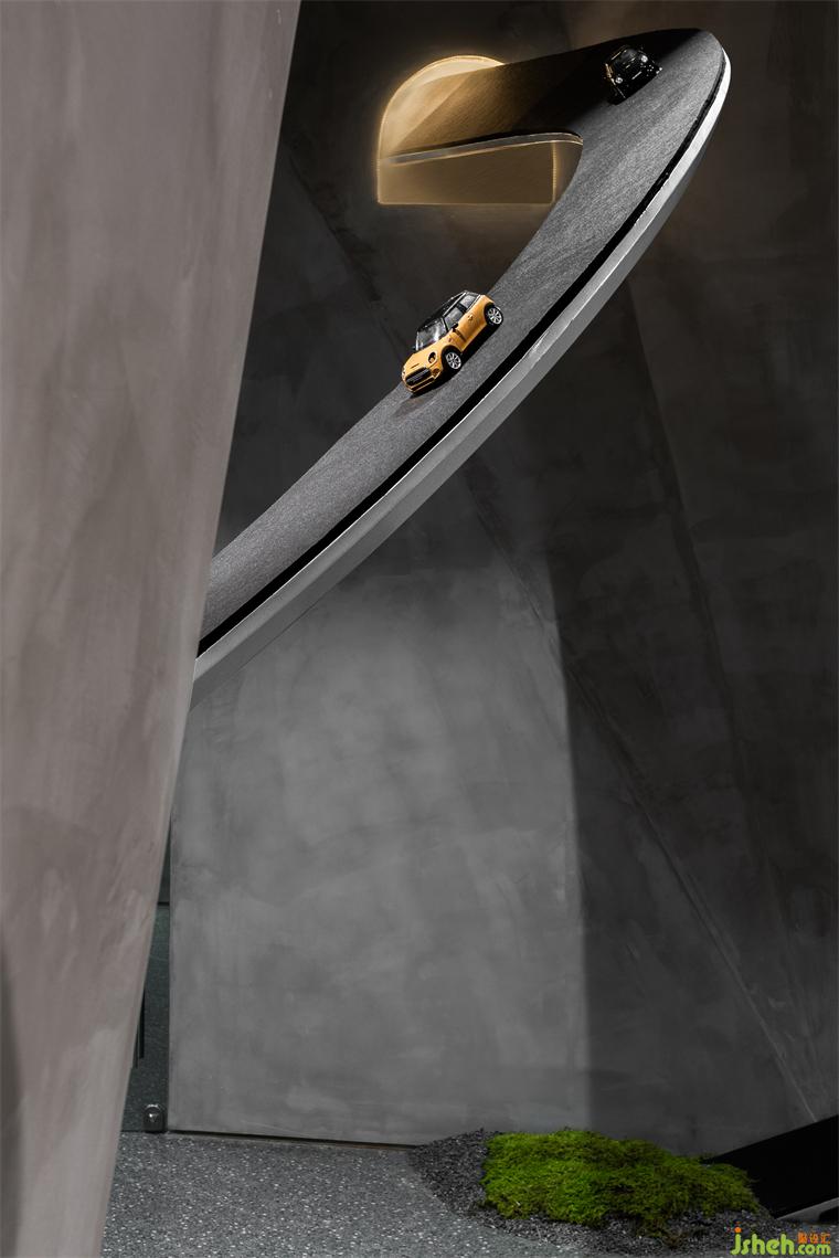 考虑到“MINI车”的巨大单体量,展厅的动线需要保证汽车在其中能够灵活挪动,展厅设计所以跑道的高度和走向设计具有一定的限制性,并且跑道所带来的视觉效果也要纳入考量。