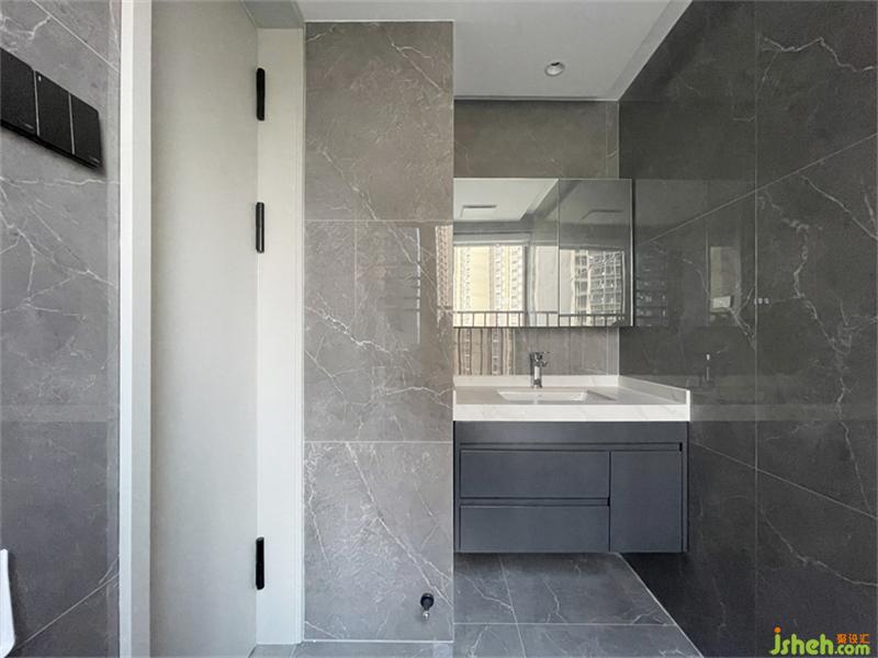 •公卫-原来尺寸偏大,缩小比例,让次卧房变大,定制的白色花纹岩板洗手台,台面延伸至壁挂式马桶位,既增加了台面的储物实用度,又增加了淋浴区的空间,让原本不可能的干湿分离得以实现,大大的改善了卫生间的水汽问题,也更整洁美观了。