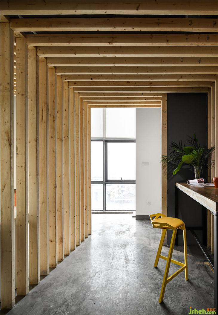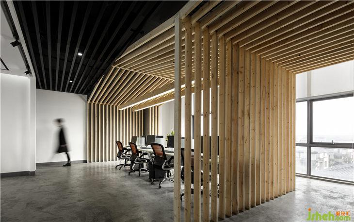 如何在有限的空间内,实现产品展示,员工办公及休闲的多重功能,同时又不失空间趣味性。设计符号上我们采用了长方形与三角形的结合,材料上选用杉木木方,进行组合搭建了一个专属空间,着重强调员工办公区域的重要属性。对办公区,迷你吧台区与展示区三个不同区域进行明显的划分。