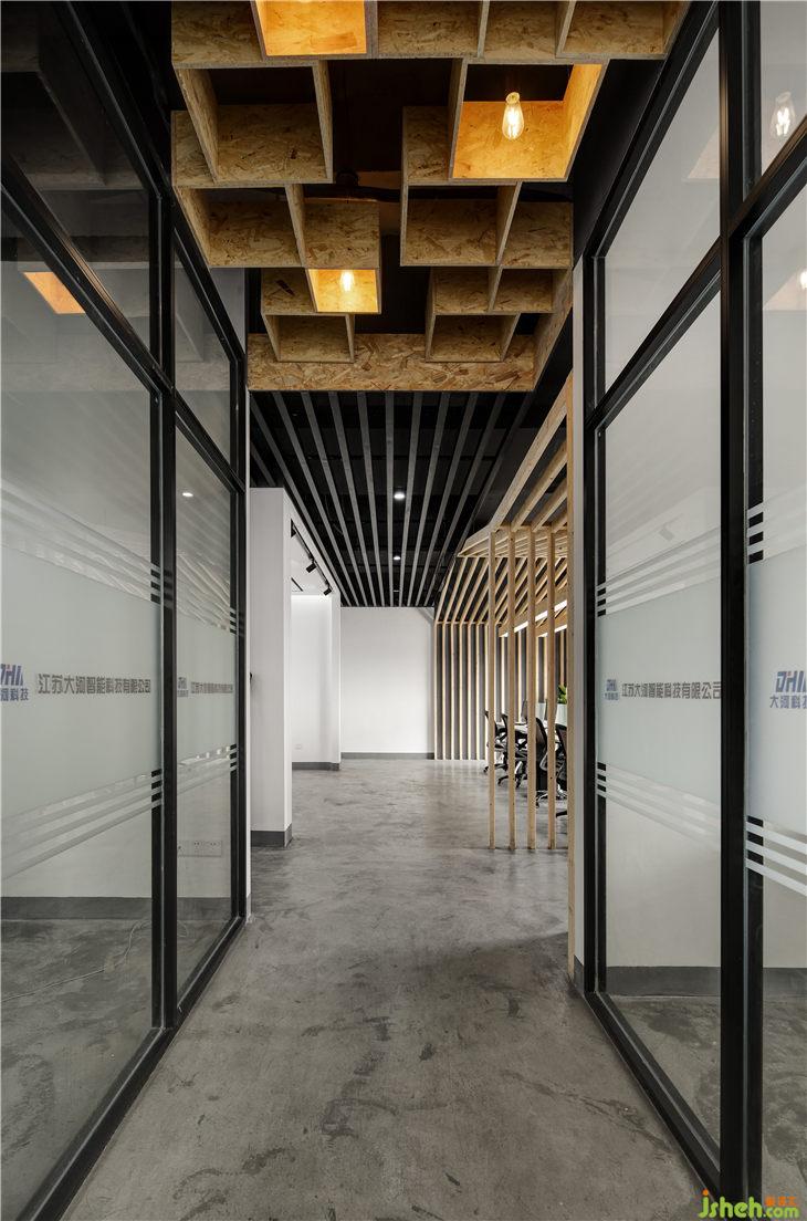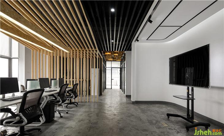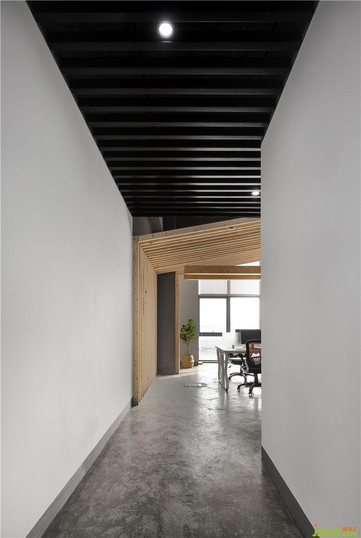 公共区域的吊顶选用黑色铝方通,配合白色乳胶漆墙面,灰色水泥地面,结合原木木方搭建的小房子加欧松板方盒子吊顶。颜色上采用黑白灰结合原木的总体基调营造一个简洁但不失趣味性的办公空间。