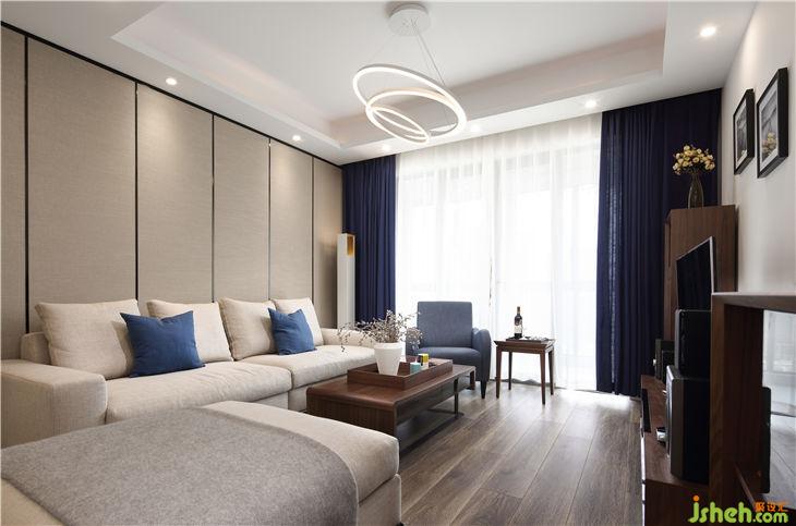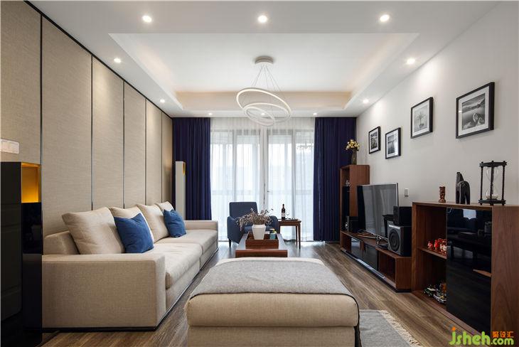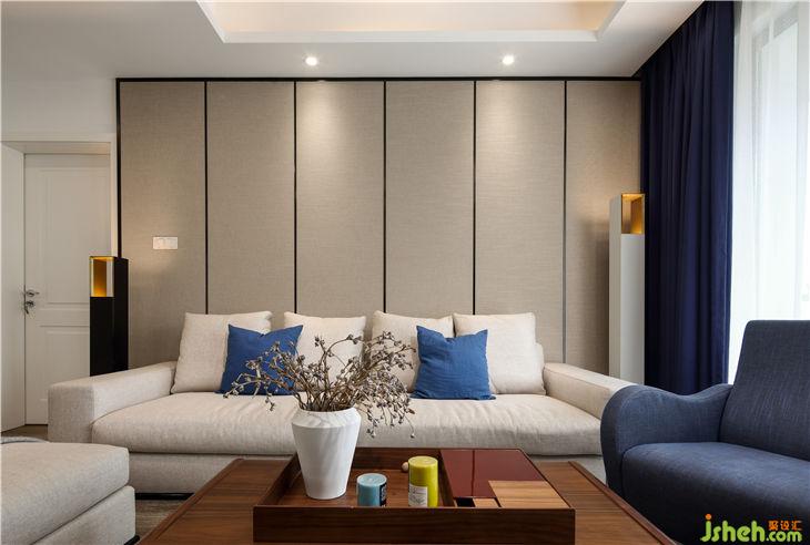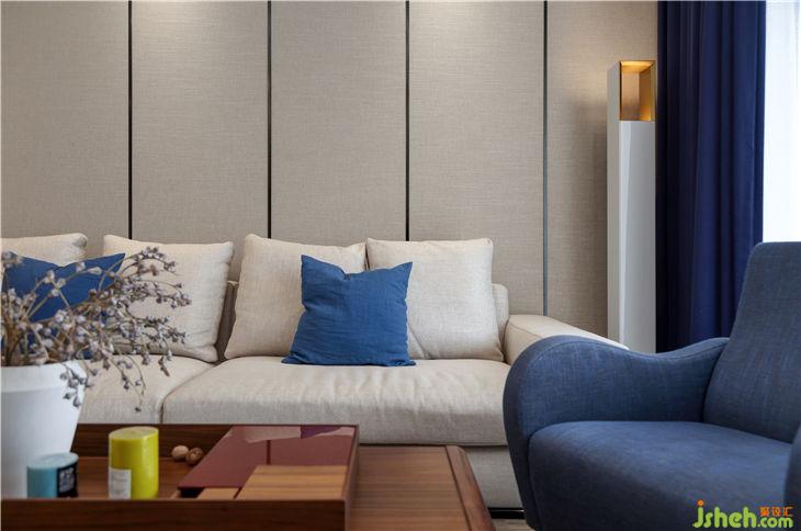 客厅:沙发背景墙的亚麻硬包和布艺沙发的材质相得益彰。设计公司