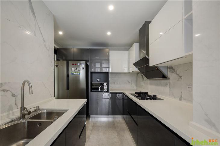 厨房:白色高柜,黑色矮柜搭配暖灰的地砖和雅白的墙砖,厨房这个原本应该是烟火气息浓重的空间也可以同样的雅致有趣