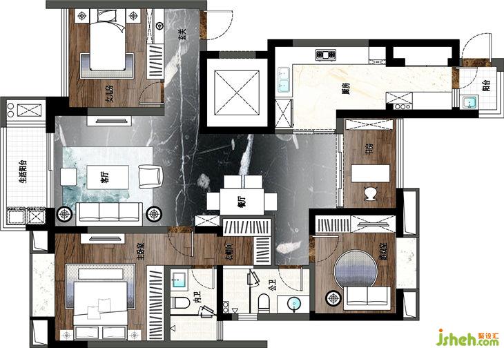 平面布置图:平面布局上满足客户的特殊要求,虽是四房格局,但最终呈现的是两居的状态。原格局主卧储物空间相对较少,为实现业主有一个独立衣帽间的愿景,在东北角次卧和外卫上做了非常大的调整,最终达成业主所想。