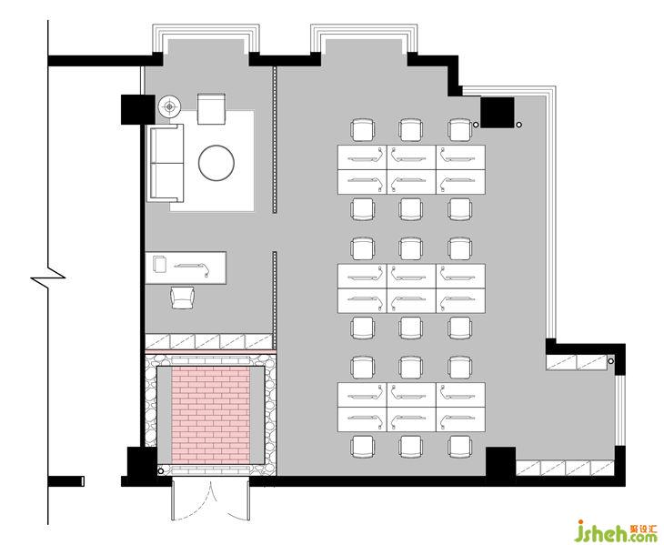 平面规划上力求使用最大化,满足18个员工办公位,经理室满足简单的接待功能,客户提出希望经理室能够保持与员工的亲密度,可以及时观察到员工的状态,不希望采用封闭的方式,但同时希望在空间上保持明显的界限划分。