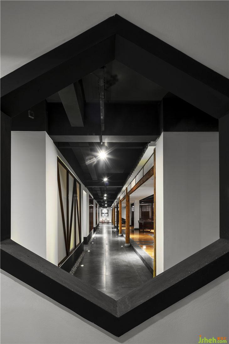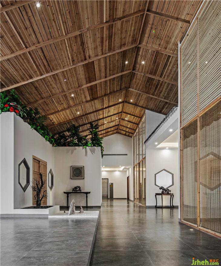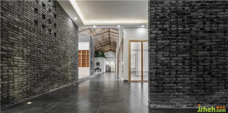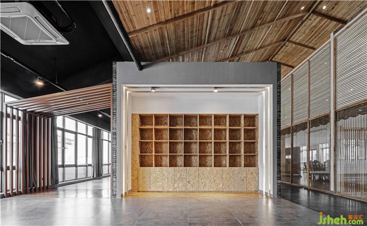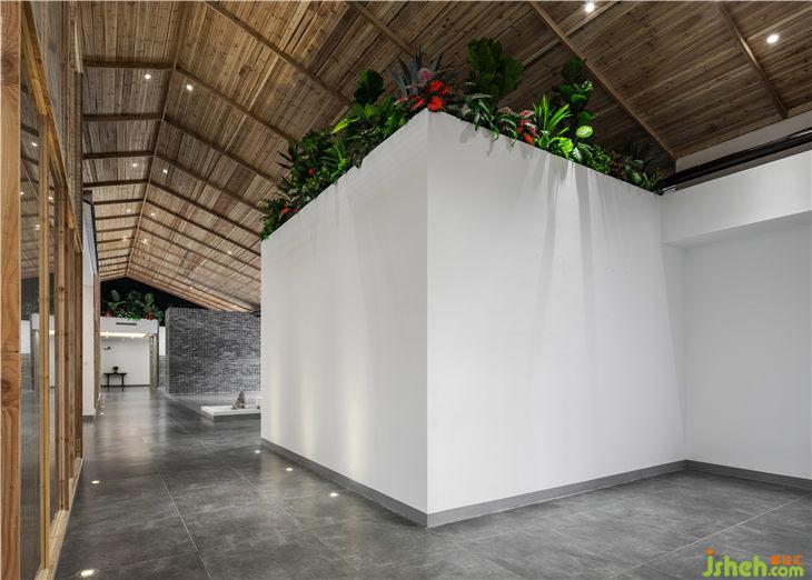 东西两边入口,白色乳胶漆墙面与江南常见的灰砖两相呼应,顶部预留足够的空间设立屋顶花园。让屋顶内再有屋顶,不同空间之间有效得到缓冲,同时解决高度不一,材质不一造成的节点收口问题。模块化的玻璃隔断有规律的一字纵向展开,用来分隔两种不同功能分区。立面上一分为二,解决6米多层高带来的困惑,材料上采用原木木方呼应公共区域的吊顶材质。