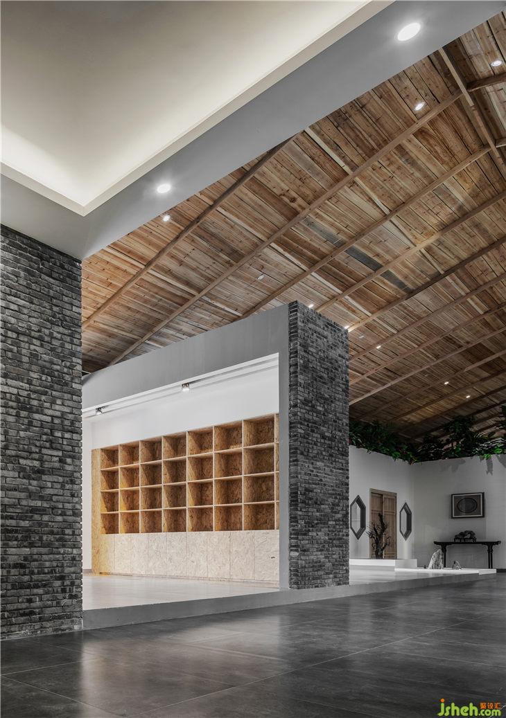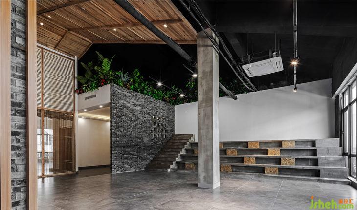 以原木为设计用材,从最高点出发,顺应原始结构,自上而下形成顶部的二次包围感,结合部分原始结构顶部喷黑,三种空间高度,二种不同材质形成对比落差。对应平面规划上设立的全开放空间,以陈设留白响应客户日后不同的功能所需。