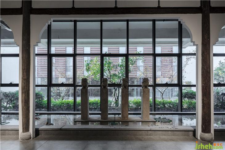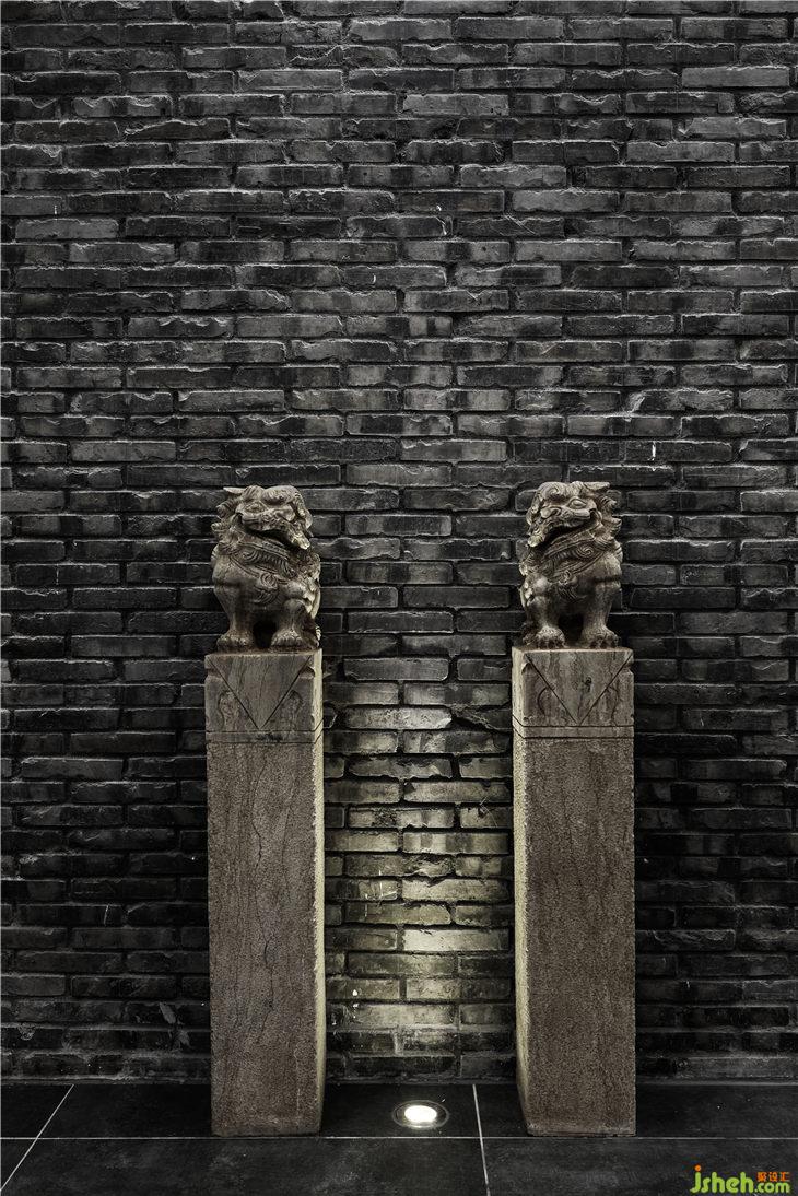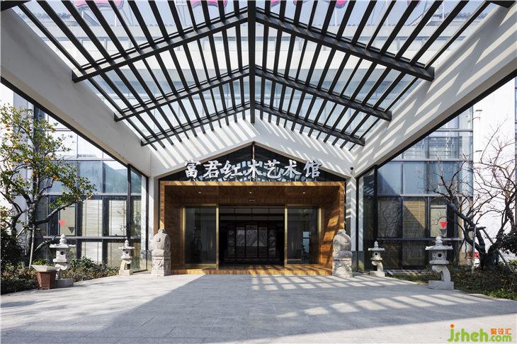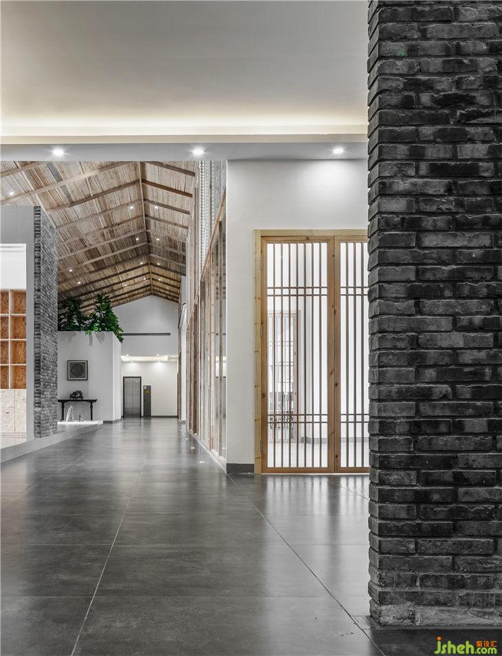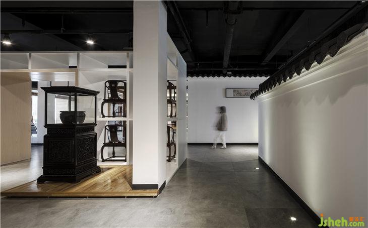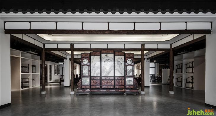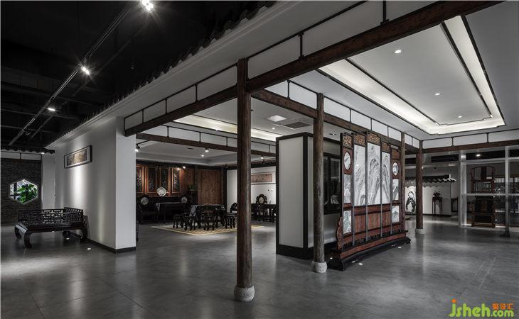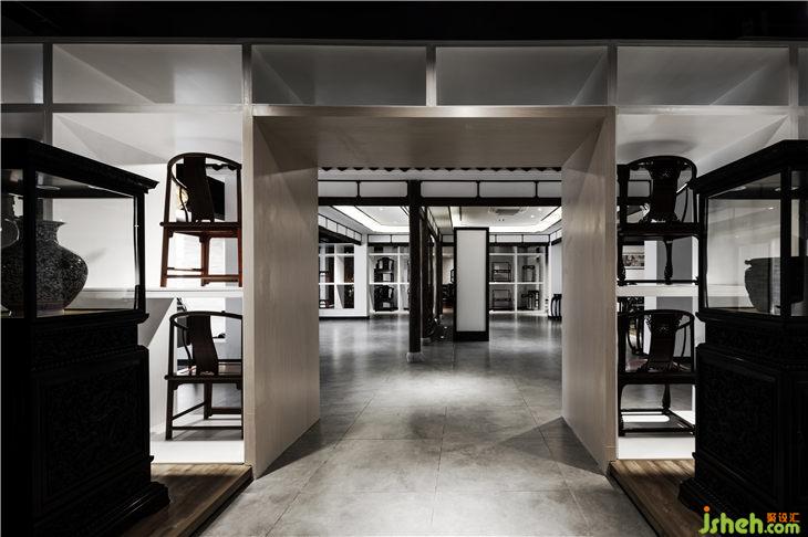 从入口开始,对原有的玻璃门进行拆除,通过内嵌一个长方形盒子来关联户外与室内的关系,原木地板上墙看似与建筑外观格格不入,却最大限度的吸引了不远处公路随行者的目光。推门进入的厅堂,采用对称格局,左右两边各设置了一排椅子墙,正厅四根当然木立柱将通道一分为三,左右出入通行。两侧设立各一排椅子墙,用于展示各种圈椅;中间预留地屏屏风位置,其后设置一厅堂,中正格局的同时为中堂产品提供了一处恰到好处的展示。