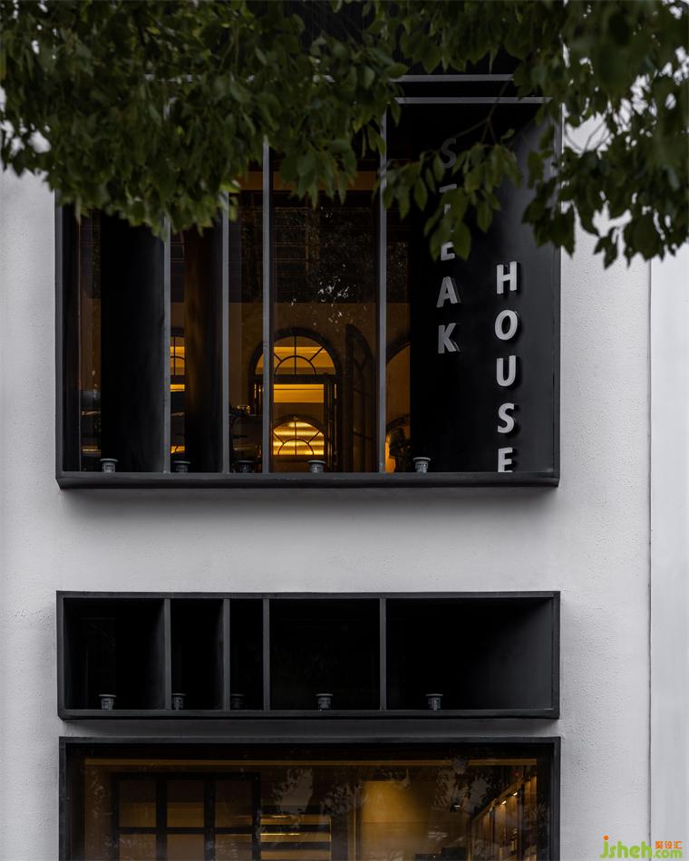 店铺居于一排沿街商铺的中间位置,原始建筑以东西窄,而南北长的方式呈现。东西3米开间,南北20米长。独特的结构形成了细长比例的建筑外立面。我们采用化零为整的方式将原来分散式的建筑外观,通过统一形式的框架装置,串联起一二层高度,并且将外立面拉升到原有建筑顶部露台。形成了视觉上的扩张及统一,极大的改善了原有的店铺外观。餐厅设计凹凸阵列的结构造型也为内部空间制造了一些有趣的光影。