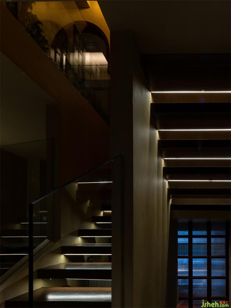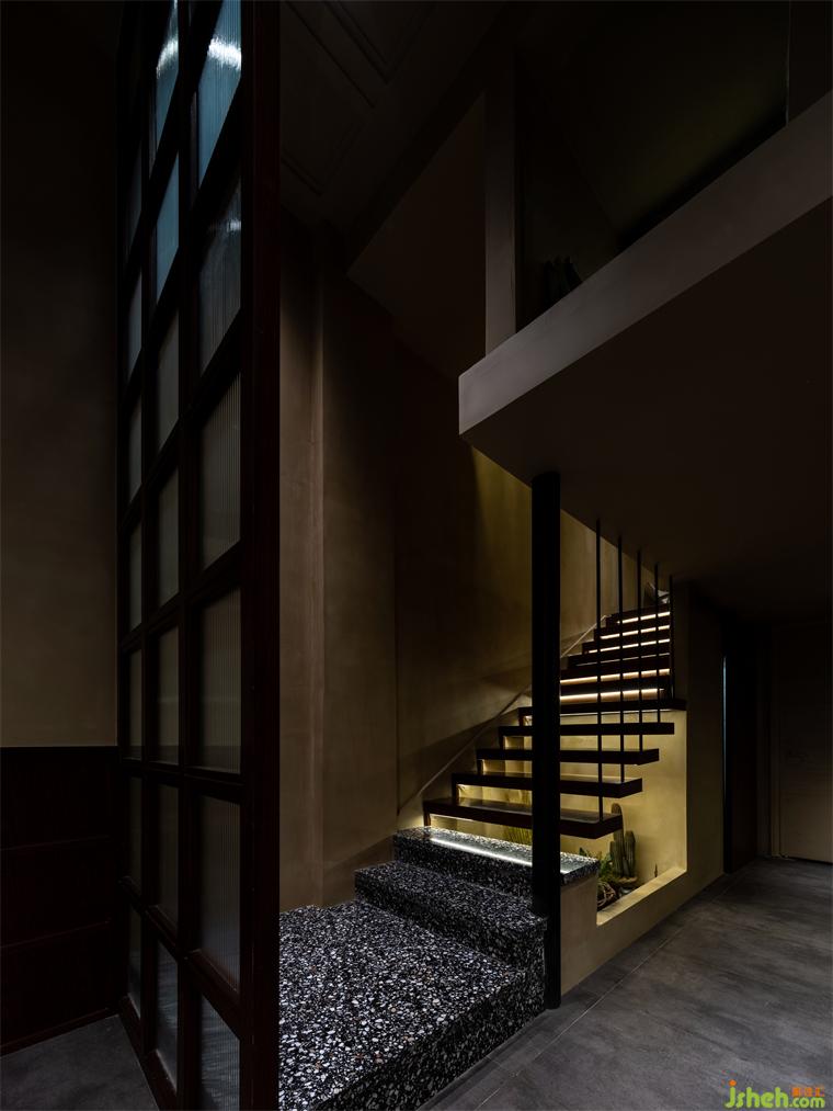 我们首先调整了楼梯及动线布局。半高的实木护墙从入口延伸至楼梯间隔断,餐厅设计而块状阵列的实木玻璃隔断则纵向延伸至顶部天花,同样一种形式演变的不同区间不同材质的碰撞,在变化与统一中寻求平衡,共同构成空间的基调。