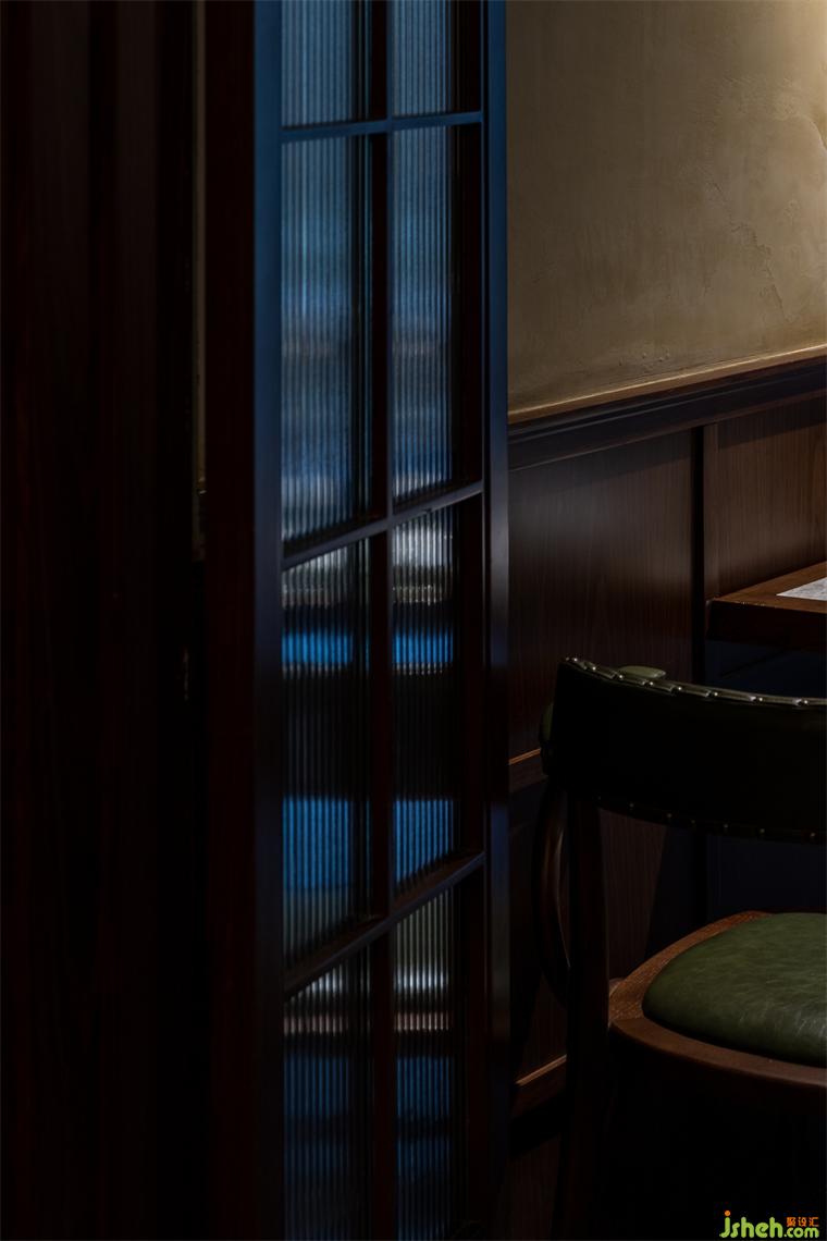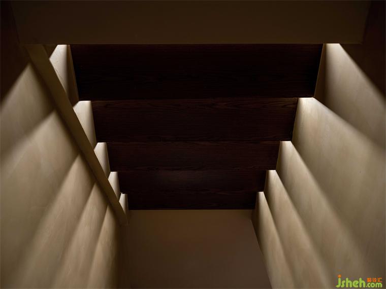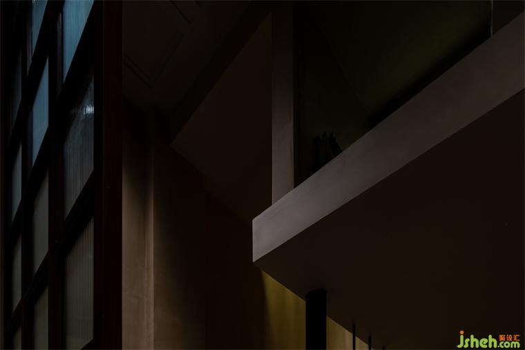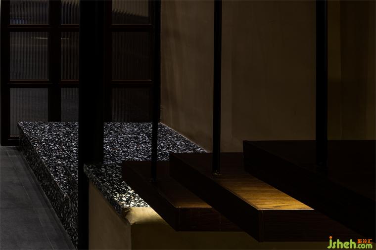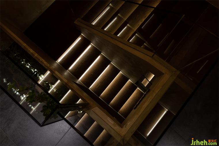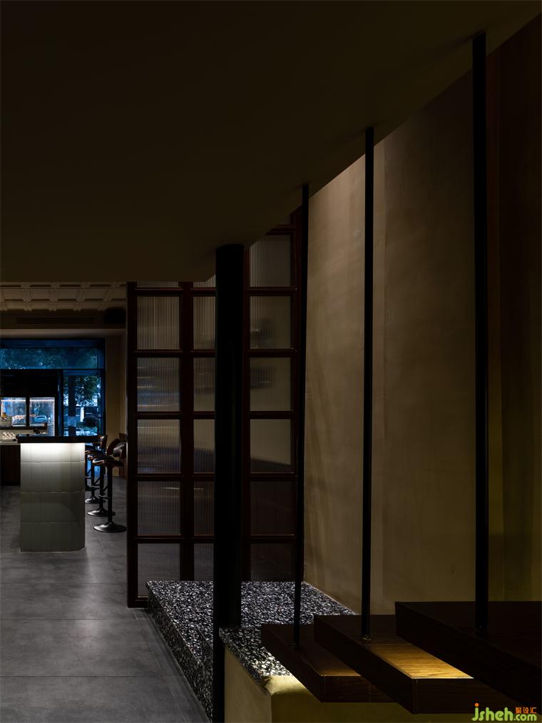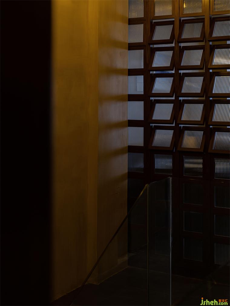 通过增设夹层的方法,大面积的转折平台既延缓了上楼梯的尺度问题,又扩大了实用空间及景观氛围。悬空的楼梯踏步弥补了尺度上的不足,同时在结构上也让空间节奏变得更有秩序。夹层与一楼产生的高差,餐厅设计制造了可观可望的空间趣味和朦胧的意境。