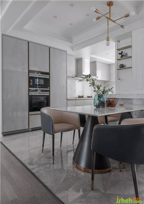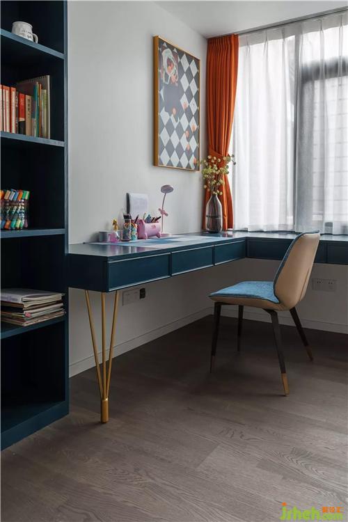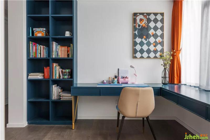 书房除却满足业主的知识需求,也需要来一场视觉的盛宴。蓝色的转角书桌与书柜让开放式的空间具有时尚与摩登感,引人注目。蓝色的元素与客餐厅的蓝色墙面形成一种呼应,让设计的张力在空间里延续。