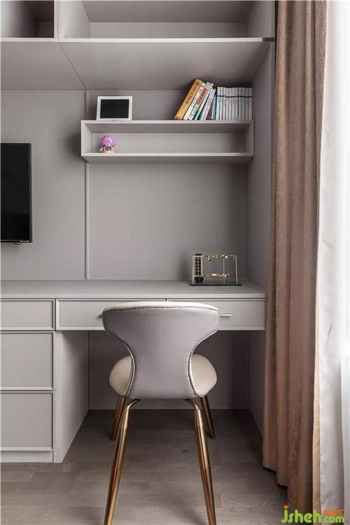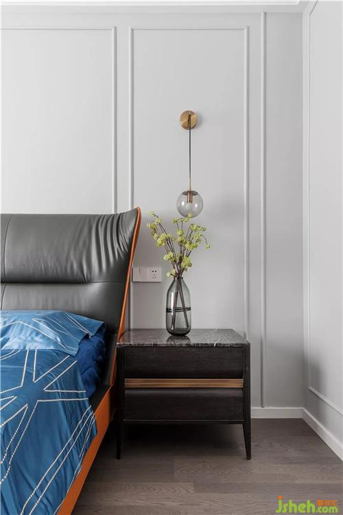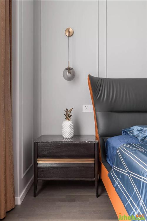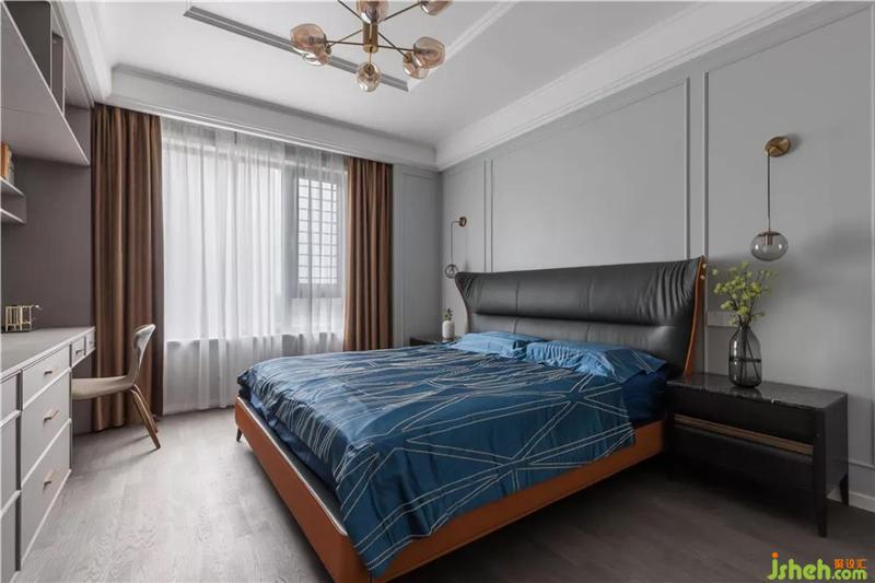 主卧以低饱和度色彩的浅色墙面为主,再配以高饱和度的真皮床具,咖色窗帘,共同构建空间的质感。别墅装饰定制的电视柜与梳妆台构成一个整体,在满足功能的同时兼具现代美感。房间整体的搭配注重营造简约舒适的空间氛围,打造自然温馨,轻松舒适的居家风格。