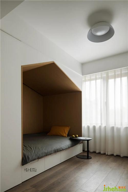 次卧的空间规划十分的精巧,满足很大的收纳空间的同时,打造了一体式的嵌入式床体,造型和材质上与整体家居相呼应,自然,个性,精美,极大的节省空间。