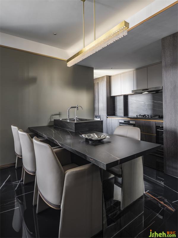 深色的高亮光大理石瓷砖犹如一片宁静的湖面,倒影着空间的每一处风景,室内设计师让仅有2.4米的层高随着视线的上下移动,给空间带来更高尺度感。以空间的反映,简单之中蕴含精致,呈现一场视觉盛宴。