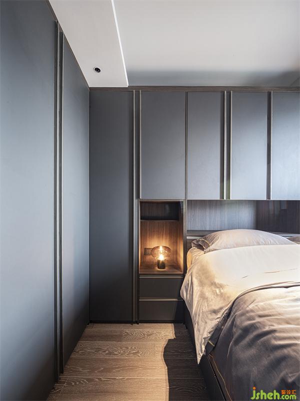 次卧更多用来作为收纳空间以及亲朋偶尔留宿用的客房,设计师巧妙运用窗边的位置,为房主人放置了一张1.8米的大床。室内设计师靠墙面带订制装饰柜的设计搭配上暖色的现代简约灯饰,明亮舒适,仪式感十足。