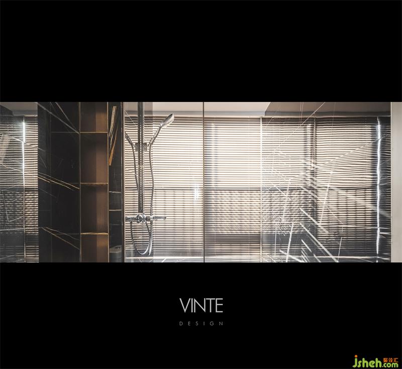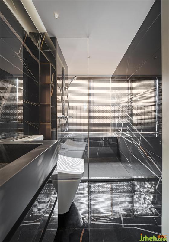 卫生间的墙面线条在黑色的亮面下显得更加具有艺术感,在阳光的照耀下又凸显出整体的高级,室内设计师增添一丝生机。
